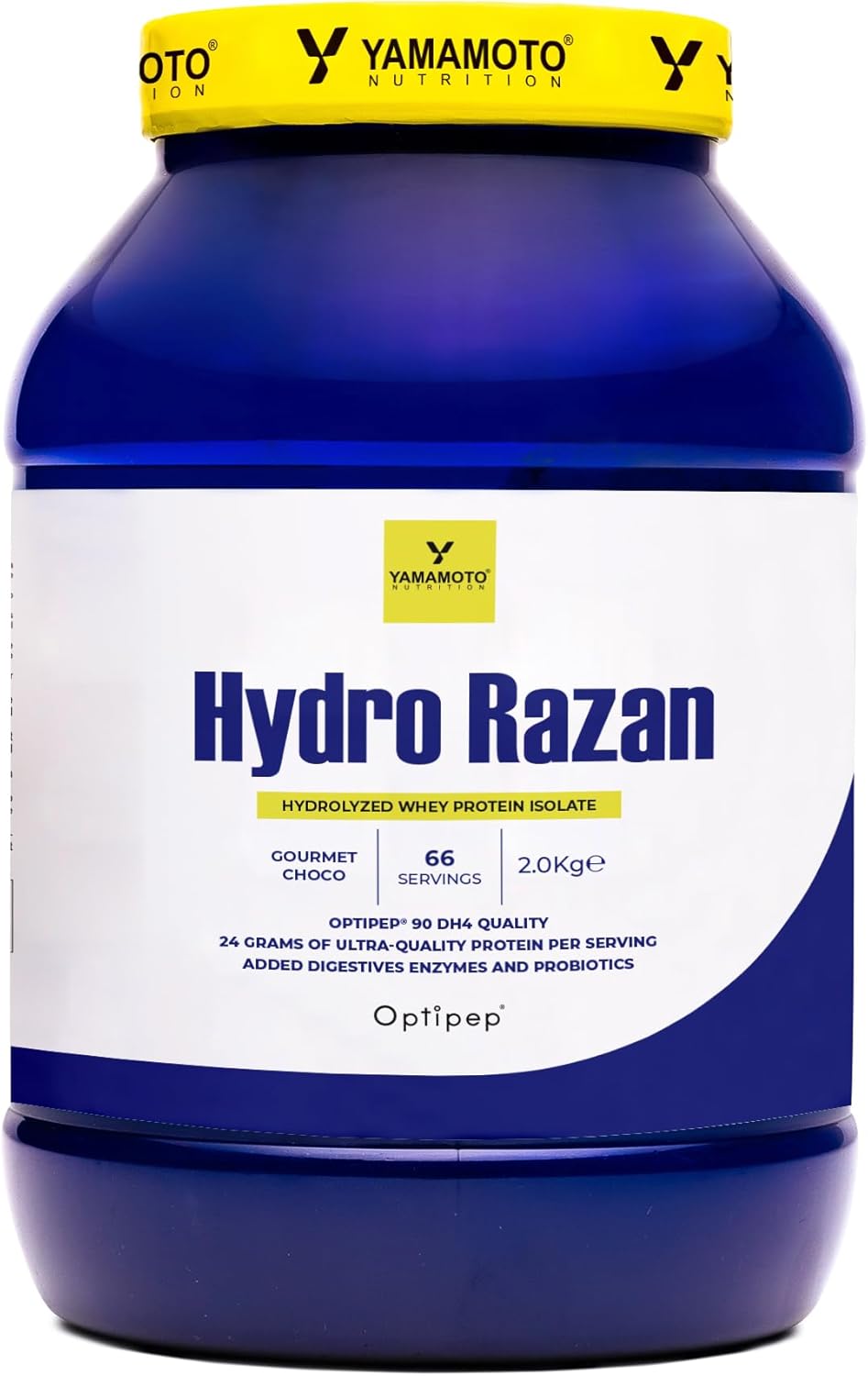 Yamamoto Nutrition presents Hydro Razan a new raw material to obtain a protein with the highest biological value.Hydro Razan is produced exclusively by the new, hydrolyzed Carbery Optipep 90 DH 4 protein, isolated by enzymatic reaction.The use of this new and unique protein made it possible Yamamoto Nutrition to produce a product with unique and irretrievable properties.Hydro Razan is produced exclusively by Optipep 90 DH 4, one of the most complete and qualitative protein sources that are now available on the market.Hydrolysis is a process of separation of proteins into simpler molecular structures, peptides, which consist of small amino acid chains that can be high -scorched and bioavailable within a short time.Comes in chocolate taste. Ingredients / ingredients Energy, fat, of which saturates, carbohydrates, of which sugars, fibre, protein, salt, vitamin B6, typical amino acid, alanine, arginine, aspartic acid, cystones, glutamic acid, glycine, histidine, isolucine, leucine, lysine, methionine, Phenylalanine, Proline, Serina, Threonine, Tryptophan, Tyrosine, Valine, Whey Protein Isolated by Cross-Flow Microfiltration (Contains emulsifiers: Sunflower Lecithin, Soy Lecithin), Flavourings, Swinger: Sweeter;Bromelain 75 GDU / (30 mg / daily can), vitamin B6 (pyridoxins hydrochlorides).supplemented by probiotic microorganisms that favor the balance of the intestinal flora.Contains lactase and bromelain digestion enzymes.New raw material to obtain a protein with the new biological value. Yamamoto Nutrition präsentiert Hydro Razan einen neuen Rohstoff, um ein Protein mit dem höchsten biologischen Wert zu erhalten. Hydro Razan wird ausschließlich durch das neue, hydrolysierte, durch enzymatische Reaktion (WHI) isolierte Carbery Optipep 90 DH 4-Protein hergestellt. Die Verwendung dieses neuen und einzigartigen Proteins hat es Yamamoto Nutrition ermöglicht, ein Produkt mit einzigartigen und unwiederholbaren Eigenschaften herzustellen. Hydro Razan wird ausschließlich von Optipep 90 DH 4 hergestellt, einer der vollständigsten und qualitativsten Proteinquellen, die heute auf dem Markt erhältlich sind. Die Hydrolyse ist ein Prozess der Trennung von Proteinen in einfachere molekulare Strukturen, Peptide, die aus kleinen Aminosäureketten bestehen, die innerhalb kurzer Zeit hochverdaulich und bioverfügbar sind. Kommt in Schokoladengeschmack. INHALTSSTOFFE / ZUTATEN Energy, Fat, of which saturates, Carbohydrates, of which sugars, Fibre, Protein, Salt, Vitamin B6, Typical amino acid , Alanine, Arginine, Aspartic acid, Cysteine, Glutamic acid , Glycine, Histidine, Isoleucine, Leucine, Lysine, Methionine, Phenylalanine, Proline, Serina, Threonine, Tryptophan, Tyrosine, Valine, Whey protein isolated by cross-flow microfiltration (contains emulsifiers: sunflower lecithin, soy lecithin), flavourings, sweetener: sucralose; bromelain 75 GDU / (30 mg / daily dose), vitamin B6 (pyridoxine hydrochloride).Ergänzt durch probiotische Mikroorganismen, die das Gleichgewicht der Darmflora begünstigen. Enthält Laktase- und Bromelain-Verdauungsenzyme. Neuer Rohstoff zur Gewinnung eines Proteins mit dem neuen biologischen Wert.Yamamoto Nutrition Hydro razan, Gourmet Choco - 2000g Schokolade 2.00 kg (Confezione da 1)