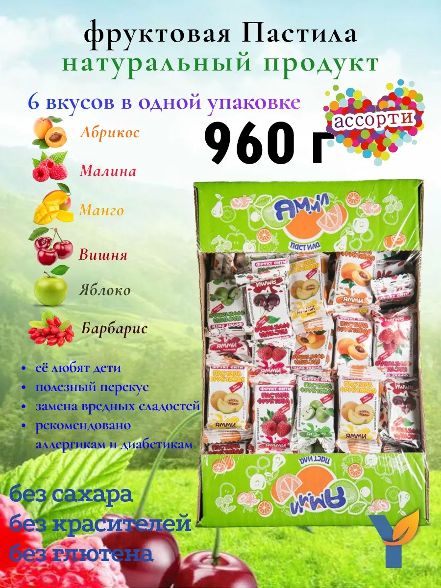 YUMMI fruit pastila is a healthy snack without sugar, flavorings, colorings, or artificial sweeteners. This natural fruit pastila is suitable for the whole family, healthy eating, and those with a sweet tooth. The package is convenient to take with you to school, kindergarten, or work as a healthy snack or dessert with tea or coffee. This delicious and healthy candy is an excellent substitute for sweets, recommended for children and dieters, vegans, and also suitable for people who care about their health and figure. This natural fruit pastila comes in 6 assorted flavors: cherry, raspberry, barberry, mango, apricot, and apple. Thanks to its bright packaging, it makes a great gift for children's birthdays, matinees, or for teachers, caregivers, bosses, colleagues, loved ones, and family on special occasions. It is an ideal substitute for candy, marmalade, marshmallows, chocolate bars, dried mango, and sugary sweets. Just like Belevskaya pastilushka and Ura-pastila, you will love our product for its excellent taste and high quality.