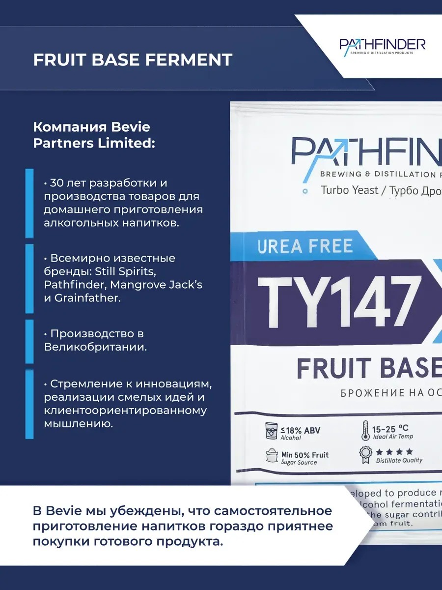 If you need to process large volumes of juice and fruit during the fruit and berry harvest season, Pathfinder "Fruit Base Ferment" alcohol turbo yeast is just what you need. Pathfinder "Fruit Base Ferment" fast-acting yeast was developed in the UK specifically for fermenting fruit and berry must. Its nutrients and microelements give it high tolerance to acidic fruit environments, as well as increased alcohol resistance. Thanks to this, moonshiners using this yeast obtain mash with an alcohol content of up to 18%. This versatile yeast allows you to prepare mash from sugar or dextrose, or add these sugars to fruit must to increase the yield of moonshine. A clear advantage of this strain is its ability to preserve the aroma of the original raw materials, meaning you will get a vibrant aroma in the final product. Pathfinder Fruit Base Ferment yeast, thanks to its high alcohol stability, is ideal for distillation or rectification and the production of beverages such as Calvados and whiskey. It will make your hobby even more interesting and exciting, and you'll be able to impress your colleagues and relatives: your grandfather, your father, your brother.