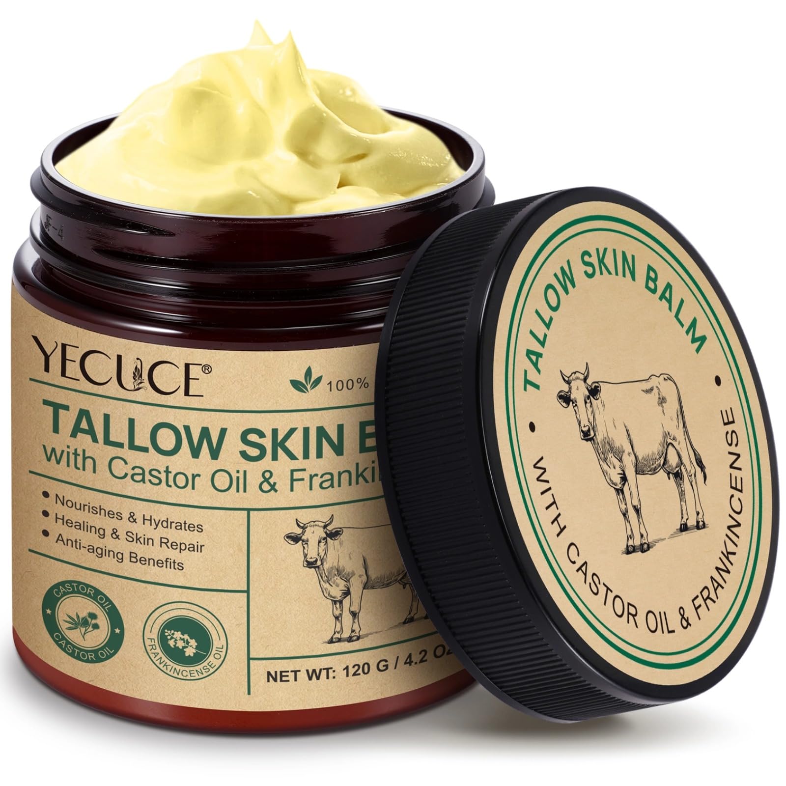 Yecuce Beef Tallow for Skin with Castor Oil and Frankincense 4.2 oz Grass-Fed Tallow Cream Face & Body Moisturizer for Dry Skin