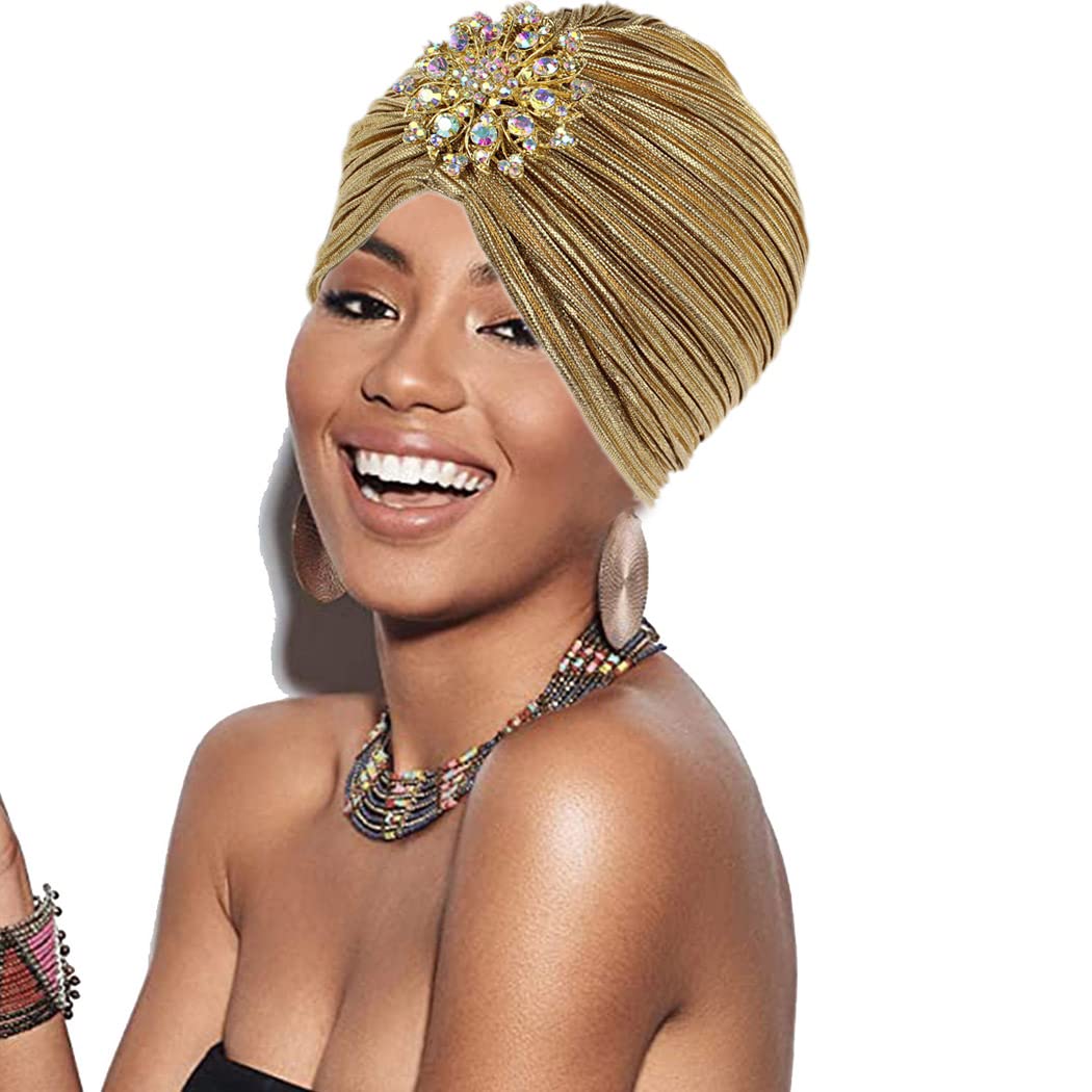 Yeilhile Vintage Women Turban Gold Pre-Tied Headwrap Crystal Headwear Ideal Daily Wear for Women