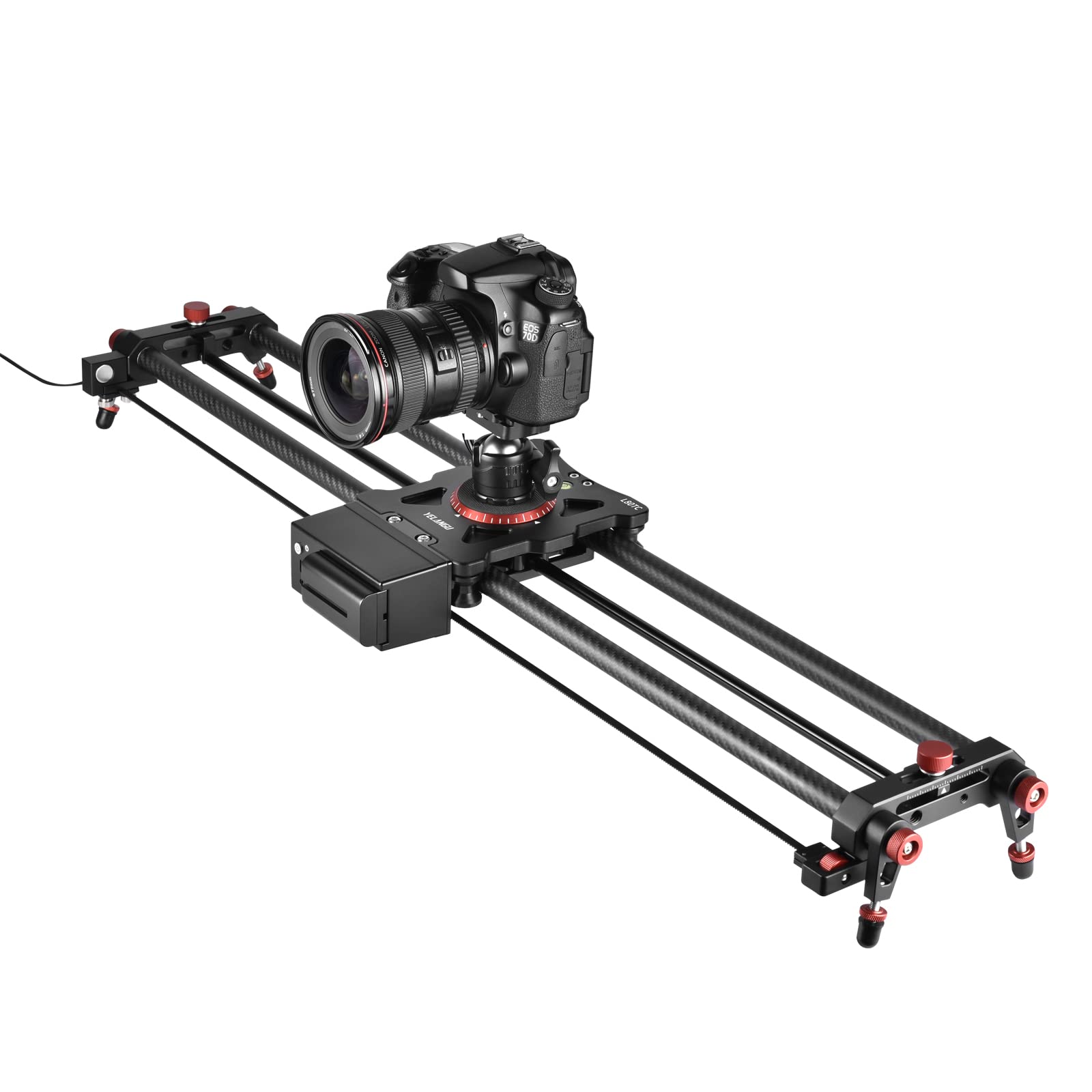 ?WIDELY UNIVERSAL COMPATIBILITY?: The electric camera slider is compatible with most camcorder and micro-camera such as Canon, Nikon, Sony, Panasonic, Samsung and PENTAX camera; 6 pieces Shutter Release Cables (C1, C3, N1, N3, S1, S2) are included. ?LIGHTWEIGHT BUT POWERFUL MOTOR?: Motorized slider main body made of aluminum alloy and slider rail made of carbon fiber. 6lb camera dolly track,lightweight and convenient to carry outside for photography. Camera track slider use 4 bearing-rollers-carrier with balance traction design, more stable and anti-shake, make sure to provide stable video and clear photography pictures.With max load of 11lb at 45°locking the power belt. ? 3 SHOTTING MODES, MULTIPLE-ANGLE SHOTTING,TIME-LAPSE AND VIDEO SOTTING ?: Motorized Camera Slider has 3 shotting modes:focusing shot , horizontal panning shotting,120 degree wide angle shoot are available. Multiple angle shotting:low angle shotting,advance forward,tilt slide and jib effect.Slider Rail supports time-lapse shooting, video shooting and auto round trip shooting. You can make the rail slider pan track round trip automatically by your remote. ?ULTRA SILENT STEP MOTOR DRIVING AND PRECISE?: Camera slider has a unique SILENT MUTE step motor driving technology which combines ultra precise step motor positioning ability with ultra silent operation. A rechargeable replacement F550 Li-ion battery and USB charger will be provided to supply power for the motor. ?WIRELESS 2.4G REMOTE CONTROL?: Camera track controlled by 2.4G Wireless Remote Control (support Time lapse or Video Shot). Remote can switch Live motion (Loop mode automatic round trip and stop to point.Manual mode can change the running direction)and Time lapse shotting can achieve long term automatic position shotting.Note: The camera and tripod ball head are NOT included in the package.