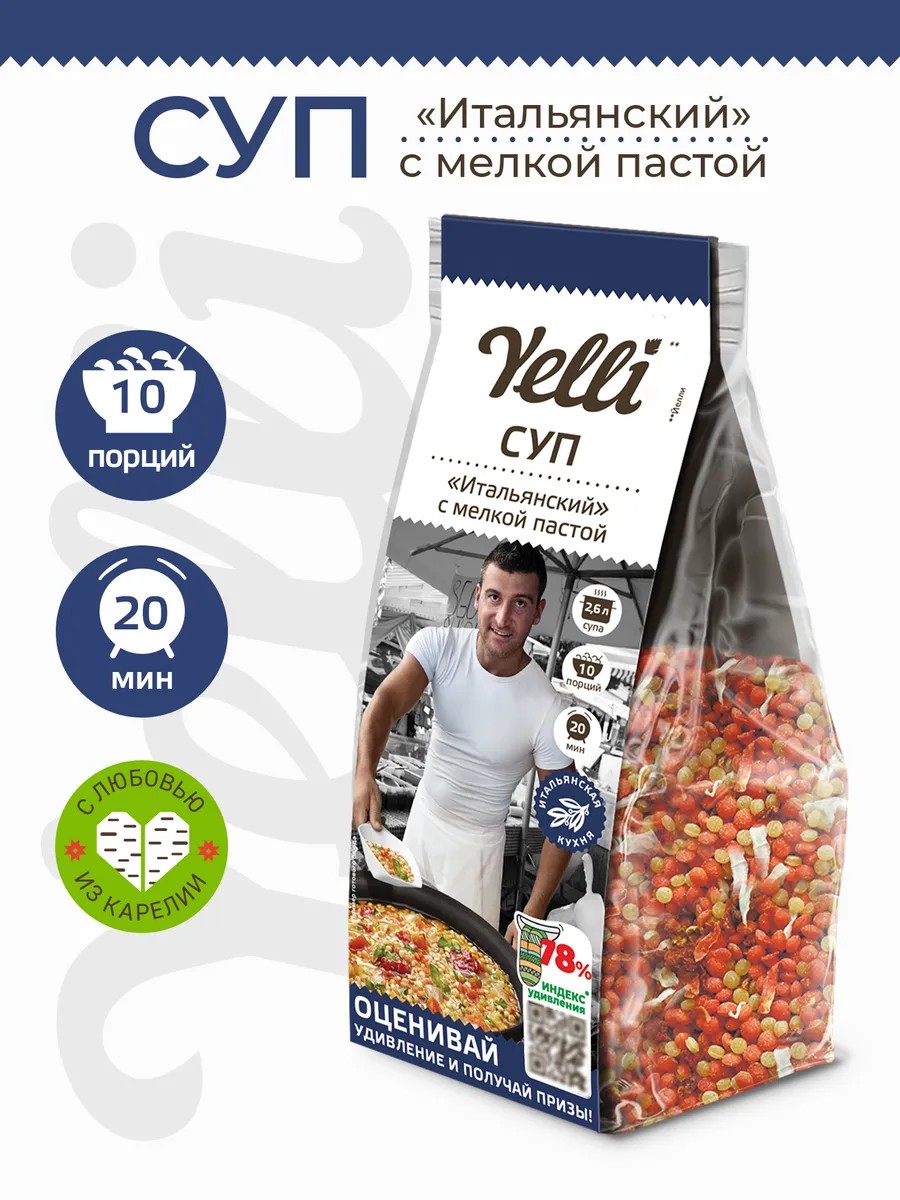 Итальянский суп – оригинальное первое блюдо, основу которого составляют красная чечевица и нежная мелкая паста. Итальянцы в любой суп, особенно с фасолью или чечевицей, любят добавлять мелкую пасту. По традиции в итальянский суп добавляют овощи, зелень, специи и тертый сыр в качестве завершающего аккорда. Бренд Yelli предлагает уже готовую основу для быстрого приготовления этого вкусного супа, поэтому вам не придется тратить время на подготовку продуктов. Всего за 20 минут вы получите большую кастрюлю супа для полноценного обеда. В 2,4 л кипящей воды или бульона нужно высыпать смесь, готовить 20 минут на медленном огне под крышкой, в конце варки посолить по вкусу. По итальянской традиции рекомендуем добавить в конце приготовления тертый сыр, чтобы дополнить и подчеркнуть вкус. Это комплексный продукт, который можно приготовить на домашней или дачной кухне в кастрюле или суповарке, а также на огне в туристическом походе. Сбалансированная смесь на 100% натуральная, не содержит ГМО и соль. Продукт подойдет людям, которые придерживаются здорового правильного питания, для вегетарианского, веганского, постного меню. В набор для приготовления супа входят богатая белками красная чечевица, нежная мелкая паста Птитим, сушеные томаты, репчатый лук, морковь, чеснок, петрушка, молотый базилик и лавровый лист, острый и пряный черный перец. Упаковка Итальянского супа – отличный подарочный вариант для любого человека, который хочет питаться вкусно, полезно и разнообразно. * Хранить продукт рекомендуется в сухом, защищенном от прямых солнечных лучей месте.* Продукт содержит глютен, может содержать следы сельдерея, сои, горчицы, арахиса, кунжута, орехов, молока и продуктов его переработки, яиц и продуктов их переработки.
