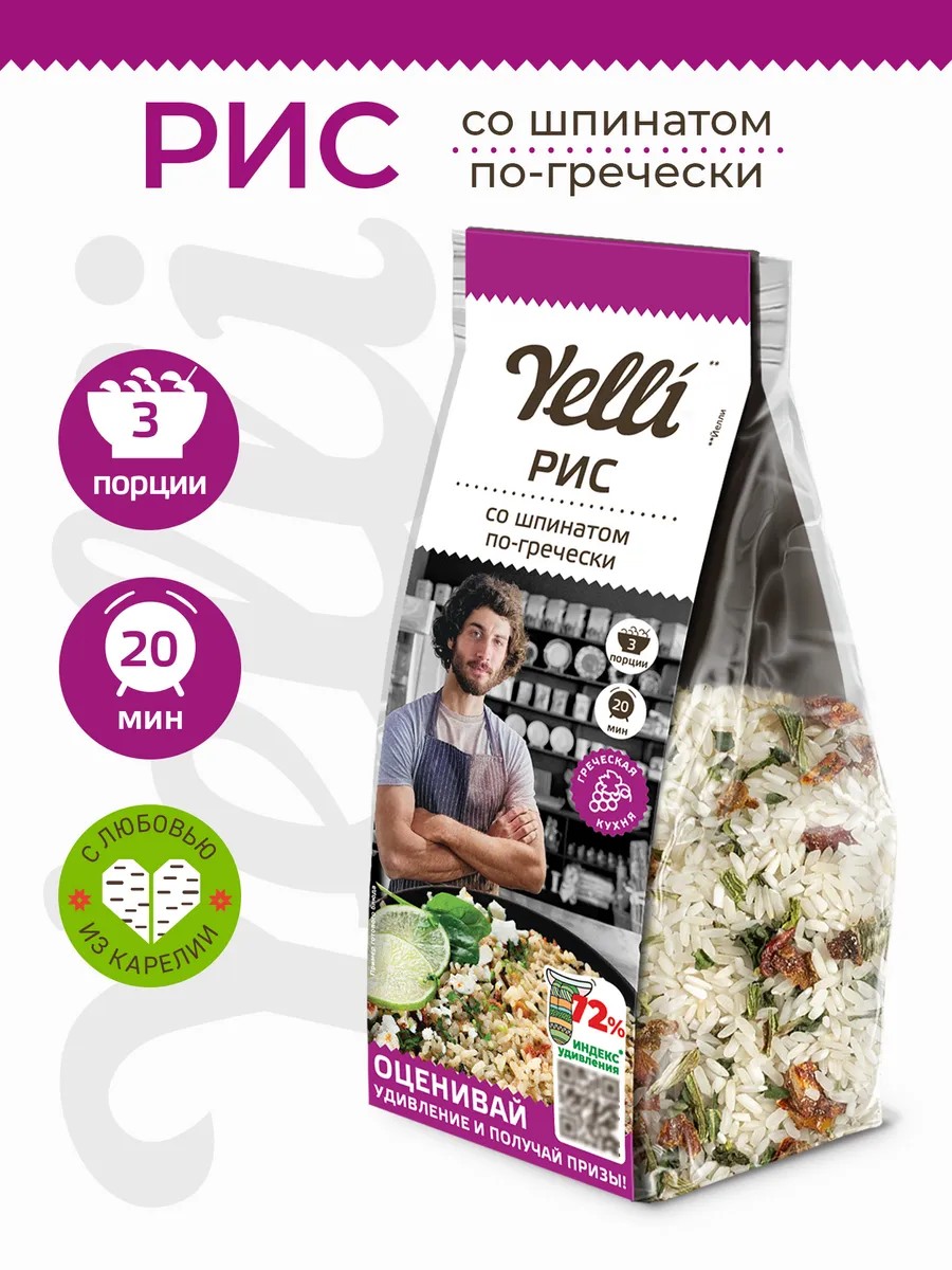 Рис по-гречески – традиционное вегетарианское блюдо, основу которого составляют длинный рис и шпинат. Можно подавать как гарнир к рыбе, мясу или курице, а также как самостоятельное блюдо с жареным яйцом, сыром Фета и лимоном.Рис со шпинатом по-гречески Yelli по достоинству оценят даже истинные гурманы. Продукт является 100% натуральным, не содержит ГМО и соли, подходит для вегетарианцев и веганов, а также тех, кто предпочитает сбалансированное правильное питание (ПП). Процесс его приготовления занимает всего 20 минут, осуществляется быстро и легко. Достаточно просто залить в кастрюлю 570 мл воды, подсолить и довести до кипения, высыпать содержимое пачки, варить на медленном огне под крышкой в течение 15-20 минут. Рис со шпинатом можно подать в качестве полезного завтрака или второго обеденного блюда. Продукция отличается тщательно подобранным составом. В ней содержится рис, смесь сушеных овощей и зелени, включая помидоры, паприку, шпинат и чеснок, а также молотый кардамон. Она является универсальной, идеально дополнит как диетическое и постное меню, так и рацион любителей более сытных блюд, ведь эту смесь можно приготовить с мясом, курицей, креветками. Блюдо легко приготовить как на домашней кухне, так и на даче и в туристическом походе. Продукт станет отличной подарочной идеей для людей, которые ведут здоровый образ жизни и следят за своим питанием.* Хранить продукт рекомендуется в сухом, защищенном от прямых солнечных лучей месте.* Продукт может содержать следы глютена, сельдерея, сои, горчицы, арахиса, кунжута, орехов, молока и продуктов его переработки, яиц и продуктов их переработки.