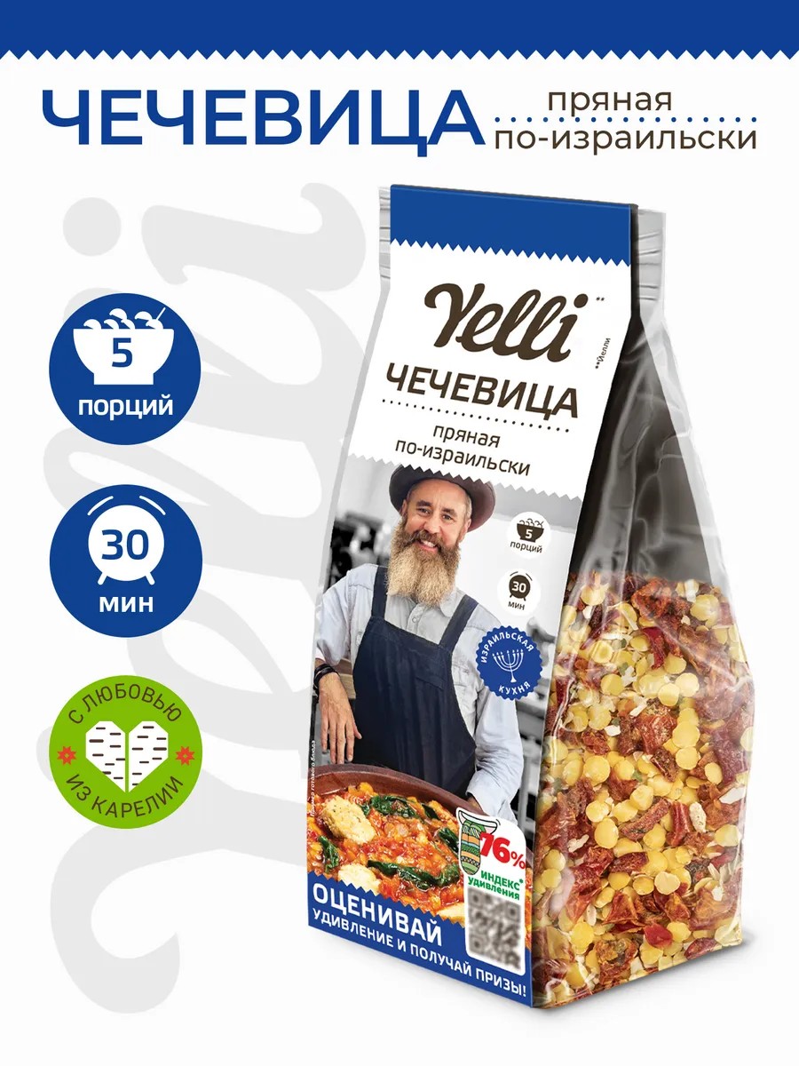 Пряная чечевица по-израильски от бренда Yelli – традиционное ближневосточное блюдо. Это густое, яркое и ароматное рагу из чечевицы с добавлением пряных трав и томатов. В Израиле готовую чечевицу заливают яйцами, а можно приготовить блюдо в постном варианте, подав с тушеным шпинатом и обжаренными слайсами тофу.Чтобы приготовить изысканный и питательный завтрак, обед или ужин потребуется всего 30-35 минут. В глубокую сковороду налить 1 л воды и 1 ст. л. оливкового масла, высыпать содержимое пачки, перемешать. Довести до кипения, убавить температуру и варить на медленном огне под крышкой 25-30 минут. Добавить 3 ч. л. томатной пасты, 2 ст. л. оливкового масла, 50 г сливочного масла и 7-8 листов шпината, перемешать. Готовить на медленном огне 2-3 минуты, снять с огня. Нарезать 100 г тофу кубиком, обжарить на 1 ст. л. оливкового масла с добавлением 1 ст. л. соевого соуса. И вот вкусный гарнир или поноценное второе блюдо уже готовы. На основе смеси можно также приготовить суп, здесь есть простор для фантазии и пожеланий повара. Смесь смело можно взять в туристический поход, приготовить на костре сытное блюдо и наслаждаться кулинарным шедевром на природе. Блюда получатся не только вкусными и ароматными, но и полезными. Чечевичная крупа богата белком и клетчаткой, сушеные овощи и пряности также обладают массой полезных свойств. В составе нет соли и ГМО, а также усилителей вкуса и других вредных добавок, все ингредиенты 100% натуральные. Пряная чечевица по-израильски - продукт, который оценят веганы, вегетарианцы, спортсмены, люди, которые ведут здоровый образ жизни и предпочитают правильное питание (ПП). Помимо этого она станет отличным подарком для всех, кто любит пробовать кухни разных стран. * Хранить продукт рекомендуется в сухом, защищенном от прямых солнечных лучей месте.* Продукт может содержать следы глютена, сельдерея, сои, горчицы, арахиса, кунжута, орехов, молока и продуктов его переработки, яиц и продуктов их переработки.