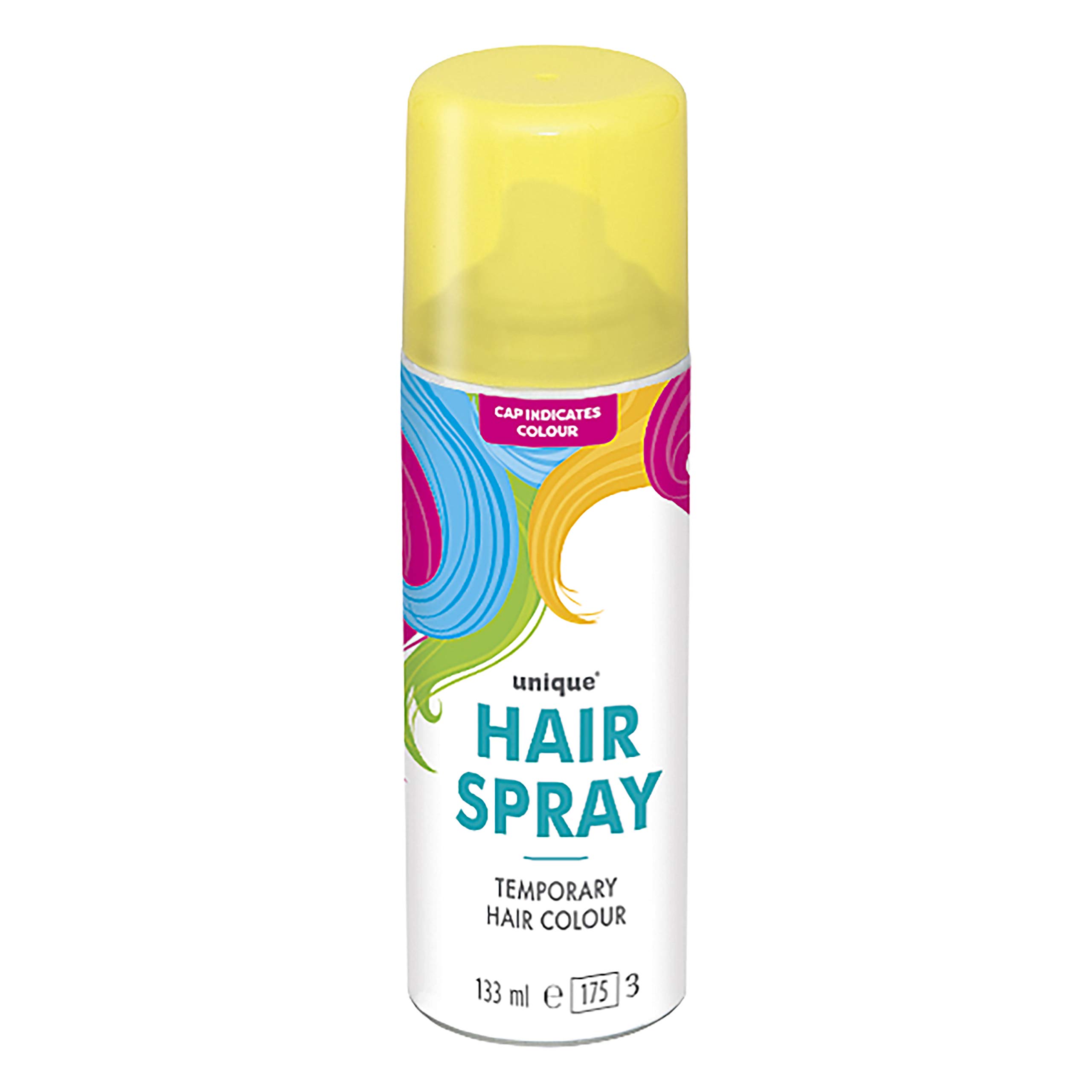 Dress up any Halloween hairdo with a burst of vibrant color using this lemony Yellow Hair Spray. Apply the sun yellow coloring on top styled hair for a quick, easy, and temporary dye-job. Use temporary hair spray for a costume party, tailgate party, or on Halloween. Create a single yellow streak or cover every strand, then easily wash it out with regular shampoo. Just be sure to shake the can for several seconds both before and during application.