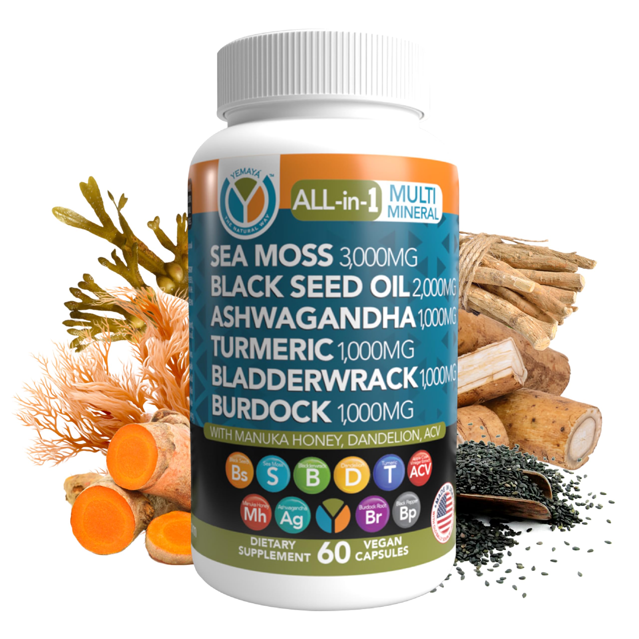 Yemay The Natural Way All-in-1 Multi Mineral Sea Moss Raw Organic Supplement with Organic Seamoss Black Seed Oil Ashwagandha Burdock Root Turmeric Vitamin C & More 60 Vegan Capsules