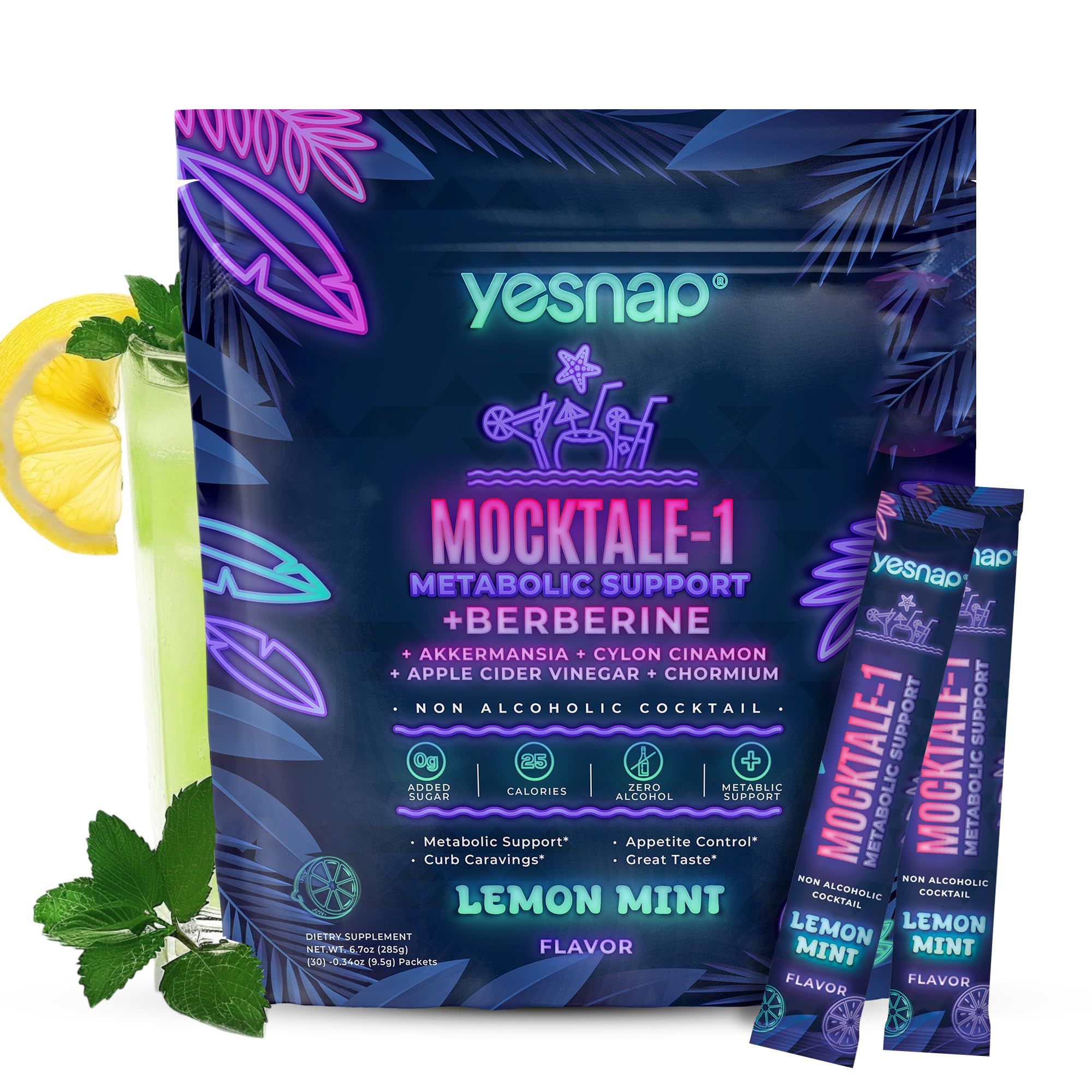 Yesnap MOCKTALE-1 Metabolic Support withBerberine & Akkermansia Chormium CylonCinamon Apple Cider Vinegar-30 PacketsLemon Mint Flavor Non-Alcoholic Cocktail