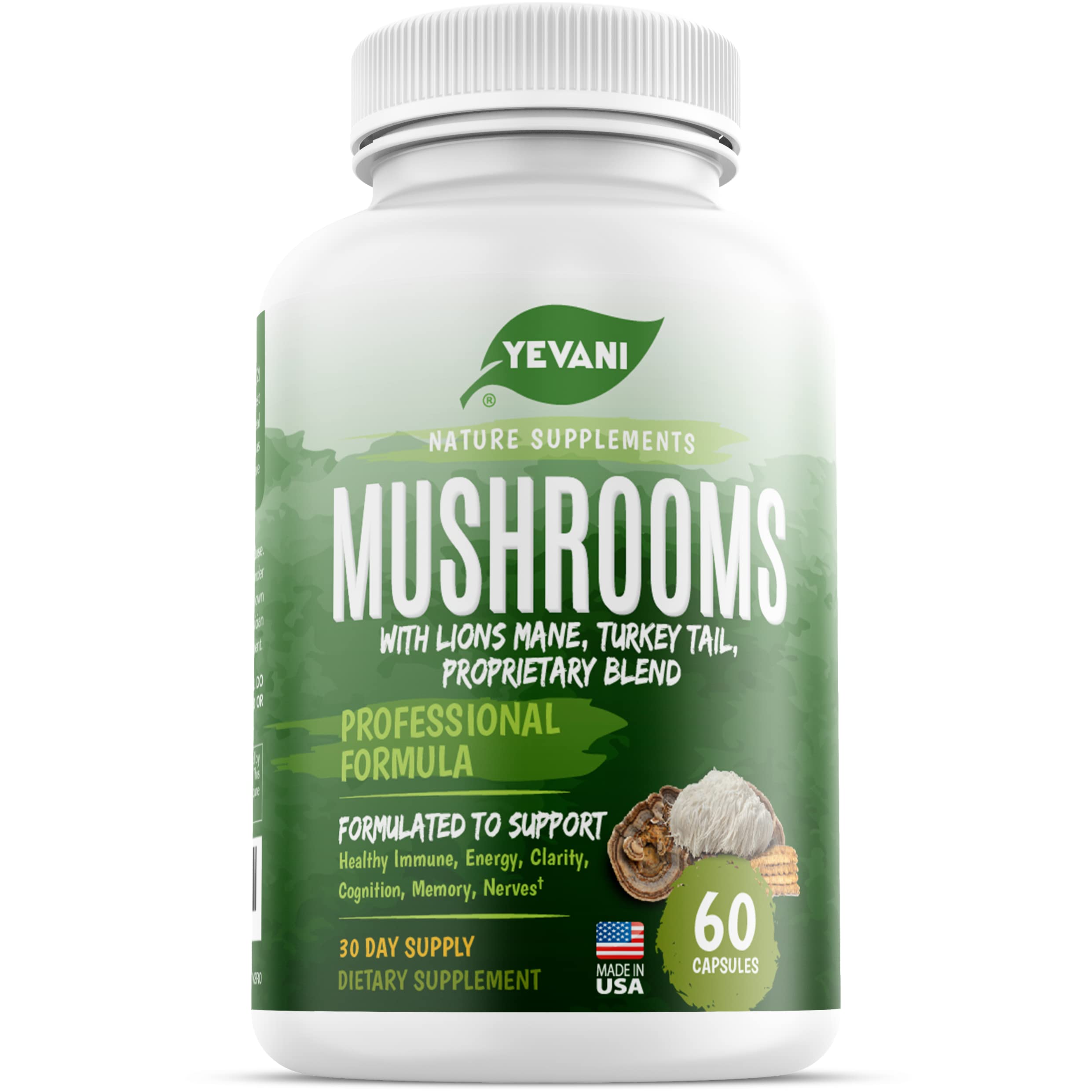 MADE IN THE USA - YEVANI is a family-owned and operated company, our Mushroom supplement is manufactured in a GMP-certified facility and are gluten-free, dairy-free, vegan-friendly, and non-GMO. NATURAL ENERGY BOOST - Elevate your energy levels naturally with Cordyceps Sinensis - increase oxygen utilization, aerobic capacity, and athletic endurance without caffeine. Plus, Reishi has been shown to improve mood and support liver health. IMPROVED BRAIN FUNCTION - Enhance memory, focus, and cognitive performance with the help of mushrooms, get the brain boost you need for work and studying. IMMUNE SYSTEM POWER-UP - Reishi mushroom extract has been used for centuries to elevate immune support and help avoid the common cold, get the daily protection you need. ENHANCE MIND, BODY SPIRIT - Unlock the power of 10 scientifically researched mycological species to boost mental clarity, immune function, natural energy and more.
