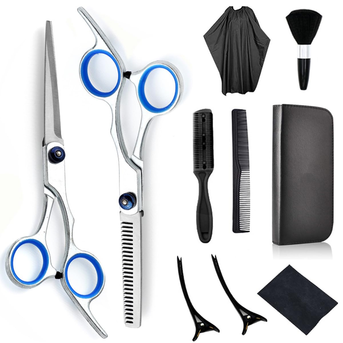 Package Includes:Precision miniature serrated scissors 1Ordinary scissors 1Clip 2Comb 1Salon Shawl 1Cleaning cloth 1Thinning comb 1Collection bag 1Hair Removal Brush 1?Exceptional Customer Service: Our commitment to strict quality standards ensures the best hair cutting experience. Contact us anytime for 24-hour support. ?Multi-Functional: Perfect for slicing wet or dry hair, ideal for both beginners and professional barbers. Great for texturizing hair for stylish looks. ?High-End Features: Includes shock absorbers at handle ends to reduce wear and noise. Adjustable screw for easy tightening or loosening of shears. ?Upgrade to a modern design featuring soft inner rubber rings for comfort and shock absorption. Crafted from high-quality stainless steel with a glossy surface and rust-resistant coating. ?Enhanced Professional Hair Cutting Scissors Set with Modern Design and Premium Coating: A pair of precision micro serrated scissors and a pair of conventional scissors,two clips, a comb,a salon capes,a cleaning cloth,thinning comb,a collection bag,a de-bristling brush.Ideal for Barbers,Salons,and Home Use.Enhanced Professional Hair Cutting Scissors Set with Modern Design and Premium Coating: A pair of precision micro serrated scissors and a pair of conventional scissors,two clips, a comb,a salon capes,a cleaning cloth,thinning comb,a collection bag,a de-bristling brush.Ideal for Barbers,Salons,and Home Use.