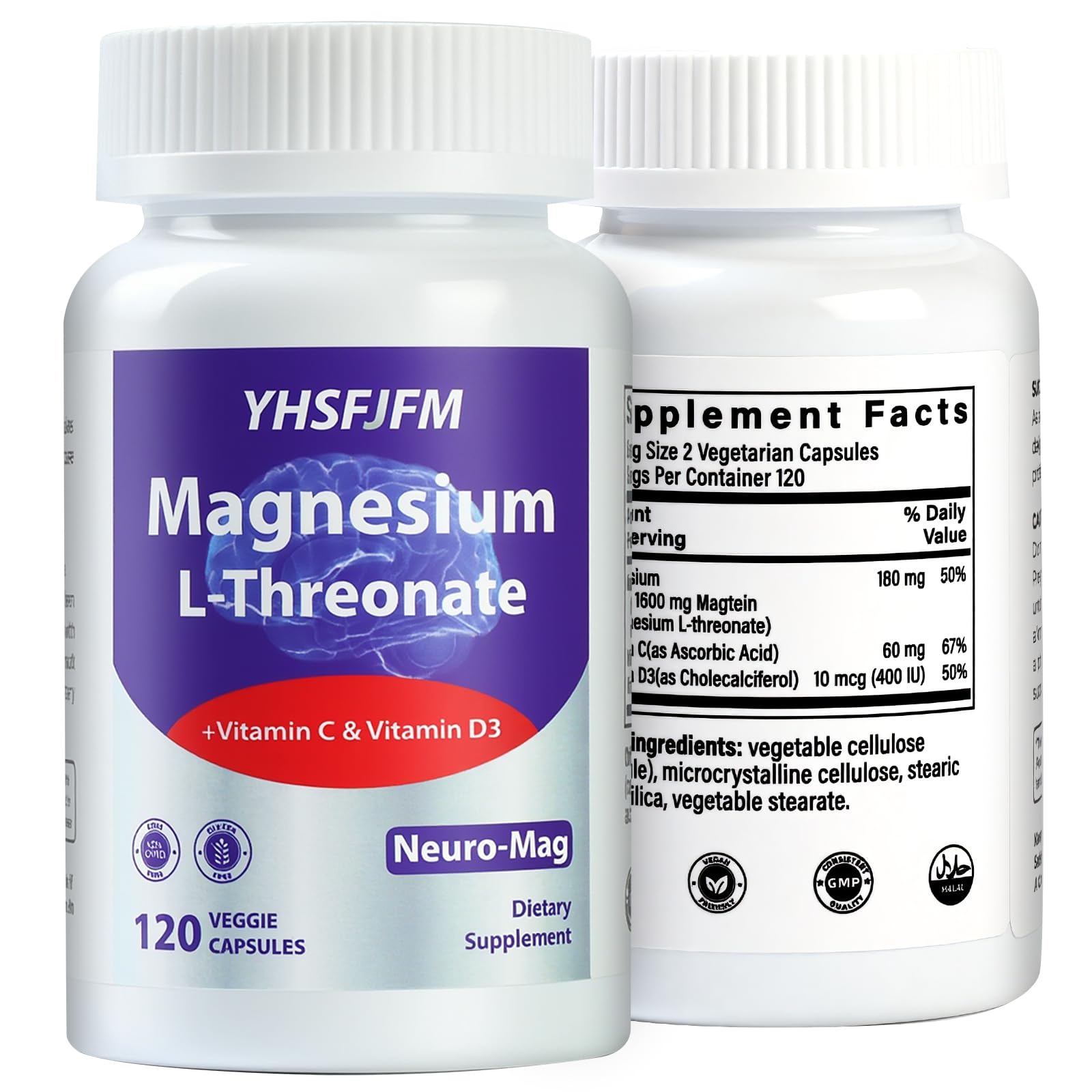 Manufactured with strict quality control standards to ensure purity and potency. Free from artificial colors, flavors, and preservatives. Each batch is tested to meet the highest standards, giving you confidence in the product you're putting into your body. Supports multiple aspects of health: magnesium for muscle relaxation, nerve function, and bone health Vitamin C for immune support and collagen synthesis Vitamin D3 for calcium absorption and immune function. Perfect for adults seeking daily nutritional support for an active lifestyle. Each bottle contains 120 capsules (60 servings), providing a full 2-month supply when taken as directed (2 capsules daily). At just 26.99 per bottle, that's only 0.45 per day – significantly more affordable than many competing magnesium complexes on the market. Formulated with Magnesium L-Threonate, known for its superior bioavailability and ability to cross the blood-brain barrier. Encapsulated in plant-based cellulose capsules, this supplement is 100 vegetarian, non-GMO, gluten-free, and soy-free, making it suitable for various dietary preferences and restrictions. Each serving delivers 180mg elemental magnesium (from highly absorbable Magnesium L-Threonate), 60mg Vitamin C, and 10mcg (400IU) Vitamin D3. This powerful combination works together to support optimal nutrient absorption and utilization, providing comprehensive support beyond single-ingredient magnesium supplements.