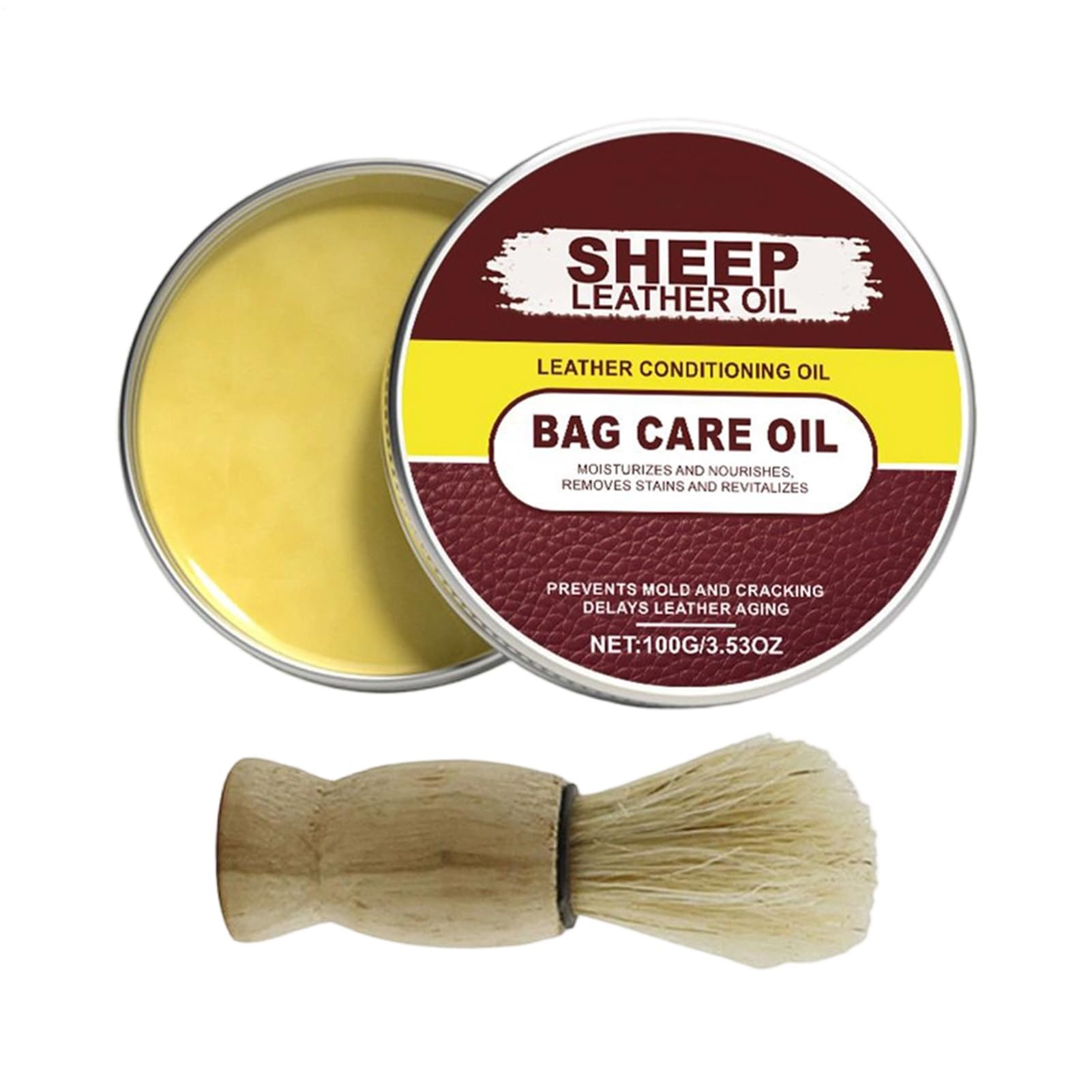 Designed to extend the life of leather by deeply conditioning its fibers, this leather conditioner offers benefits for daily care and also works as an excellent solution for wooden items, preserving the beauty and functionality of items such as belts, chairs, and cases. Features: Product Name: Leather Conditioner Net Contents: 100g Product Weight: 135g Product Dimensions: 10.2 x 12.4 cm Brush Size: 7.5 x 2.3 cm Package Contents: 1 x Leather Conditioner 1 x Brush Note: 1. Due to lighting effects and viewing angles, there may be slight color variations in the product. 2. Due to manual measurement, there may be slight errors in the product size. Thank you for your understanding.Multiple Uses: This leather conditioner ensures greater ease of use for leather goods by providing nourishment and protection. It functions as a versatile solution that works perfectly on wood and provides consistent care for accessories, upholstery, and home decor items. Time-Saving Application: This leather shoe conditioner comes with a brush for perfect application, allowing users to effectively restore and protect leather surfaces without unnecessary hassle in both informal and formal settings. Gentle Conditioning: Designed as a leather boot conditioner, this product ensures thorough hydration without glue or damage to protective coatings. It offers a gentle and safe solution for treating leather and wood items, perfect for preserving premium materials in everyday environments. Scratch Resistant: The leather conditioner creates a robust barrier that resists scratches and discoloration, providing reliable defense against wear and tear to keep leather surfaces clean and pristine. This makes it ideal for frequently used items such as bags, shoes, and furniture exposed to constant handling. Restores natural oils: This leather conditioner effectively restores the natural oils of leather items, preventing dryness and cracking while providing nourishment that keeps them shiny and supple for everyday use, such as bags, shoes and furniture, ensuring lasting quality and a naturally improved appearance without overly promising results.Après-shampoing en cuir pour bottes – Crème de polissage naturelle de 100 ml avec brosse pour selle – adoucir rajeunir restaurer les sacs fissurés et décolorés par le soleil chaussures –DESCRIPTION DU PRODUIT Conçu pour prolonger la durée de vie du cuir en conditionnant profondément ses fibres, ce cuir offre des avantages pour les soins quotidiens et fonctionne en même temps comme une excellente solution pour les objets en bois, tout en préservant la beauté et la fonctionnalité d'articles tels que les ceintures, les chaises et les étuis. Caractéristiques : Nom du produit : pour l'entretien du cuir. Contenu net : 100 g. Poids du produit : 135 g. Dimensions du produit : 10,2 x 12,4 cm. Taille de la brosse : 7,5 x 2,3 cm. Contenu : 1 x soin du cuir. 1 brosse. Remarque : 1. En raison des effets d'éclairage et des angles de visualisation, il peut y avoir des différences de couleur dans le produit. 2. En raison de la mesure manuelle, il peut y avoir des erreurs dans la taille du produit, merci de votre compréhension.Utilisations multiples : le cuir garantit une plus grande facilité d'utilisation des articles en cuir en fournissant nutrition et protection, fonctionnant comme une solution polyvalente qui fonctionne parfaitement sur le bois et fournit un soin constant pour les accessoires, les tissus d'ameublement et les articles de décoration intérieure. Application gain de temps : ce conditionneur de chaussures en cuir est livré avec une brosse pour une utilisation parfaite, ce qui permet aux utilisateurs de restaurer et de protéger efficacement les surfaces en cuir sans tracas inutiles dans les environnements informels et formels. Conditionnement doux : conçu comme un conditionneur de bottes en cuir, ce produit garantit une hydratation complète sans colle ni dommage aux revêtements de protection, offrant une solution douce et sûre pour le traitement des articles en cuir et en bois, parfaite pour préserver les matériaux haut de gamme dans les environnements quotidiens. Résistant aux rayures : le conditionneur pour cuir crée une barrière robuste qui résiste aux rayures et à la décoloration, offrant une défense fiable contre l'usure pour garder les surfaces en cuir propres et vierges, ce qui le rend idéal pour les articles fréquemment utilisés tels que les sacs, les chaussures et les meubles exposés à une manipulation constante. Restaure les huiles naturelles : cet adoucissant pour cuir restaure efficacement les huiles naturelles des articles en cuir, prévenant la sécheresse et les fissures tout en fournissant une nutrition qui les maintient brillants et flexibles pour un usage quotidien, comme les sacs, les chaussures et les meubles, assurant une qualité durable et une apparence naturellement améliorée sans résultats trop prometteurs.