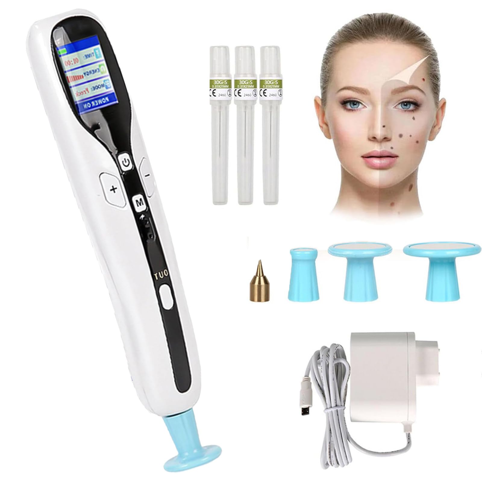 DESCRIPTION DU PRODUIT SKIN REJUVENATION FUNCTION: Accelerates skin metabolism, promotes collagen regeneration and relieves skin aging. It inhibits melanin, brightens skin tone, improves texture, reduces pores, increases skin elasticity, fights aging and improves atopic dermatitis. OZO-NE FUNCTION: Ozo-ne is produced by high-frequency ionic electrolysis of oxy-gen from the air. Removes fungus and mites, inhibits inflammation and is very effective in eliminating acne. In addition, ozone sterilizes and converts into oxygen, leaving no residue or secondary pollution. FUNCTION: -- 8 intensity levels: adjustable according to personal needs. -- 2 working modes: mole removal and ozone plasma -- USB charging: wireless charging, easy to use. -- Display: Displays battery charge, time, intensity and mode. -- Easy to use: control by buttons and display. SPECIFICATION: Output voltage: 12V Output current: 2A Output power: 10W Gear adjustment: 1 to 8 Modes: 2 types Packaging dimensions: 30 x 24.5 x 7 cm Weight: 1.35 kg PACKAGE CONTENT: 1 x Host 7 x Heads 1 x charging cable. Charge the device before first use. Be careful when using it, focusing on the skin areas (birthmarks, warts, freckles, etc.). For further instructions and precautions, please refer to the attached manual.PORTABLE CONVENIENT:This portable mole remover has a smart design, elegant shape and is ergonomic. With it, anyone can do it anytime, anywhere. Practical and practical, save time and money. WRINKLE REMOVE: Plasma energy contracts and rearranges aging cells by sputtering, while inhibiting melanin precipitation, keeping skin luminous and flawless, refining skin texture, reducing pores and improving its elasticity. PROMOTES ABSORPTION: By stabilizing cavitation, it increases the flow of nutrients between cells and promotes cell absorption. In addition, it opens the channels in the cell membrane to accelerate the absorption of the product. LED DISPLAY: LED display shows time, power intensity, mode and start status. 2 operating modes, 8 intensity levels. It can be adjusted according to personal needs. PLASMA PEN: Converts electrical energy into thermal energy to remove spots or spots from the skin, allowing them to come off naturally. This cleanses the skin, accelerates wound healing and improves skin immunity.2 in 1 Plasma Pencil(Ozone Freckles), For Removing Warts, 8 Levels of Intensity 7 Heads Lcd Display, Skin Care Removal of Moles, WartsDESCRIPTION DU PRODUIT SKIN REJUVENATION FUNCTION: Accelerates skin metabolism, promotes collagen regeneration and relieves skin aging. It inhibits melanin, brightens skin tone, improves texture, reduces pores, increases skin elasticity, fights aging and improves atopic dermatitis. OZO-NE FUNCTION: Ozo-ne is produced by high-frequency ionic electrolysis of oxy-gen from the air. Removes fungus and mites, inhibits inflammation and is very effective in eliminating acne. In addition, ozone sterilizes and converts into oxygen, leaving no residue or secondary pollution. FUNCTION: -- 8 intensity levels: adjustable according to personal needs. -- 2 working modes: mole removal and ozone plasma -- USB charging: wireless charging, easy to use. -- Display: Displays battery charge, time, intensity and mode. -- Easy to use: control by buttons and display. SPECIFICATION: Output voltage: 12V Output current: 2A Output power: 10W Gear adjustment: 1 to 8 Modes: 2 types Packaging dimensions: 30 x 24.5 x 7 cm Weight: 1.35 kg PACKAGE CONTENT: 1 x Host 7 x Heads 1 x charging cable. Charge the device before first use. Be careful when using it, focusing on the skin areas (birthmarks, warts, freckles, etc.). For further instructions and precautions, please refer to the attached manual.PORTABLE CONVENIENT:This portable mole remover has a smart design, elegant shape and is ergonomic. With it, anyone can do it anytime, anywhere. Practical and practical, save time and money. WRINKLE REMOVE: Plasma energy contracts and rearranges aging cells by sputtering, while inhibiting melanin precipitation, keeping skin luminous and flawless, refining skin texture, reducing pores and improving its elasticity. PROMOTES ABSORPTION: By stabilizing cavitation, it increases the flow of nutrients between cells and promotes cell absorption. In addition, it opens the channels in the cell membrane to accelerate the absorption of the product. LED DISPLAY: LED display shows time, power intensity, mode and start status. 2 operating modes, 8 intensity levels. It can be adjusted according to personal needs. PLASMA PEN: Converts electrical energy into thermal energy to remove spots or spots from the skin, allowing them to come off naturally. This cleanses the skin, accelerates wound healing and improves skin immunity.