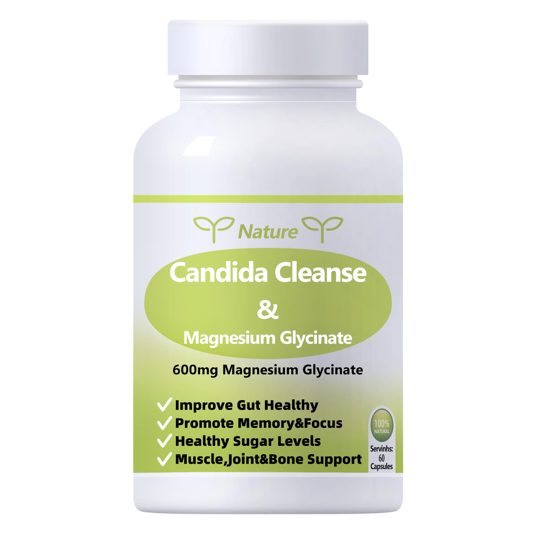 YNATUREY Candida Cleanse - Gut & Colon Support Magnesium Glycinate 600mg Women and Men Supplement with Magnesium Malate Vitamin D B6 for Gut Support & Sleep for Adults 60 Capsules