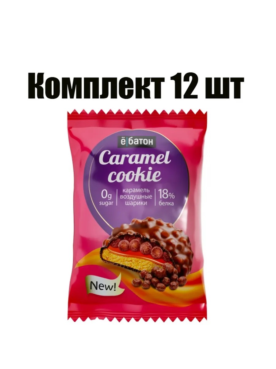 Ёбатон Протеиновое печенье Caramel cookie карамель и рисовые шарики, 45 г, 12 шт. Печенье «Ёбатон» Caramel Cookie — это хрустящее лакомство в шоколадной глазури с тремя вариантами топингов: рисовые шарики, семечки подсолнечника или арахис с изюмом. Содержит сывороточный и молочный белок (18% от порции) для поддержки мышц. Хрустящие рисовые шарики, семечки подсолнечника или арахисовая паста с изюмом. Подслащено сукралозой и сиропом топинамбура (пребиотик). Подходит для перекуса в дороге или на тренировке.