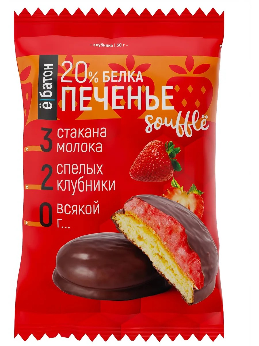 Протеиновое печенье ё/батон с суфле - бесподобный десерт, состоящий из 3х частей. Нежнейшее белковое суфле без сахара, на мягком протеиновом печенье, покрытый шоколадной глазурью. Фитнес-десерт для тренирующихся и ведущих здоровый образ жизни людей. Это не просто протеиновое печенье, это настоящий десерт для тех, кто следит за своим питанием и здоровьем. Наш продукт состоит из высококачественных ингредиентов, таких как белок, витамины и минералы, которые помогут вам получить необходимую энергию и поддерживать ваш организм в отличной форме. Нежное белковое суфле с ароматом спелой клубнички на мягком протеиновом печенье, покрытое молочной глазурью. Фитнес-десерт для тренирующихся и ведущих здоровый образ жизни людей
