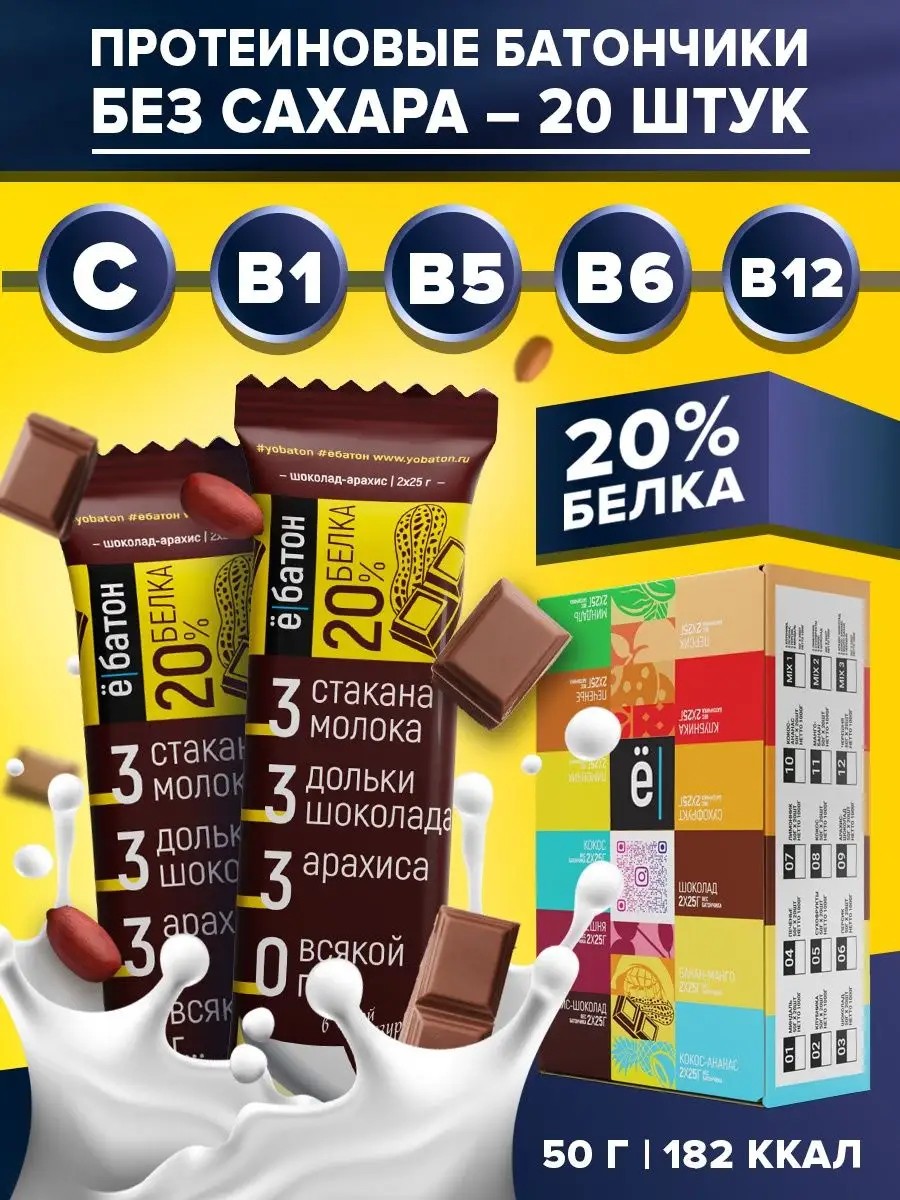 Протеиновые батончики без сахара, без глютена, 20% белка, со вкусом шоколад-арахис 50 г. х 20 шт. Ёбатон. Протеиновый батончик спортивные ёбатон с высоким содержанием белка и клетчатки, позволят быстро утолить голод, а сочетание разных видов протеинов будут длительное время являться надежными источниками энергии. Оптимальный продукт для похудения, никаких лишних калорий. В состав фитнес батончиков от ТМ ё батон входят 8 важнейших витаминов и минералов для укрепления иммунитета и защитных сил организма, различные виды протеина, клетчатка и особые активные компоненты. Важно, что они предназначены не только для спортсменов, а для всех людей, следящих за своим питанием, кому заменяют вредные сладости и выпечку в течение дня. Также протеиновые батончики спорт пит отлчино подходят для похудения так как являются полезными сладостями.
