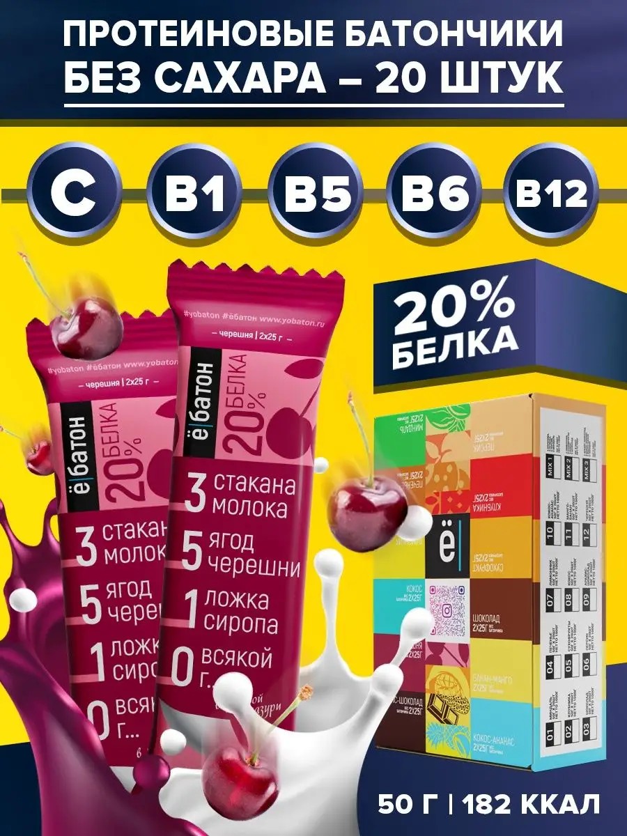 Протеиновые батончики 20% белка со вкусом черешня 50 г. 20 шт. Ёбатон с цельным лесным орехом - бесподобный натуральный продукт, который непременно доставит вам удовольствие! Каждый батончик содержит углеводы, необходимые для восстановления сил и энергии человеческому организму. Поэтому батончик рекомендуется для спортсменов или людей, которым нужна удобная закуска на бегу. С батончиками ёбатон перекус превращается в море удовольствия. Ведь они не только очень вкусные и мягкие, но и содержат порцию ценнейшего белка для роста и восстановления мышц, а также пищевые волокна, которые и для пищеварения полезны, и насыщение на долгое время дает. Так что, перекусив подобным батончиком, вы долго не будете хотеть есть и сможете без приступов голода -дожить до следующего основного приема пищи.