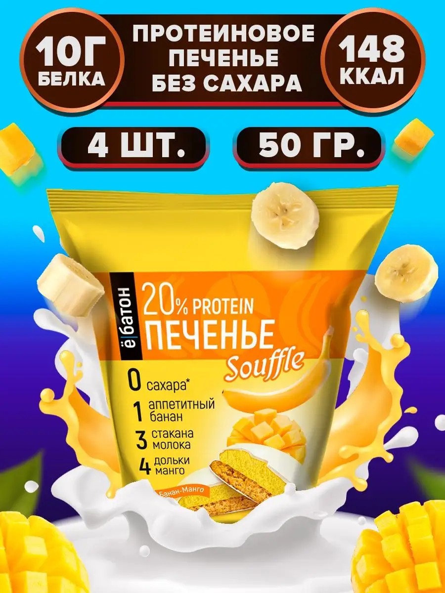 Протеиновое печенье с белковым суфле 20% белка, со вкусом манго-банан, 4 шт. по 50 г. - бесподобный десерт, состоящий из 3х частей. Нежнейшее белковое суфле без сахара, на мягком протеиновом печенье, покрытый шоколадной глазурью. Фитнес-десерт для тренирующихся и ведущих здоровый образ жизни людей. Рекомендации по употреблению: в перерывах между едой/быстрый полезный перекус, как дополнительный источник легкоусвояемых белков. Противопоказания: индивидуальная непереносимость компонентов продукта.