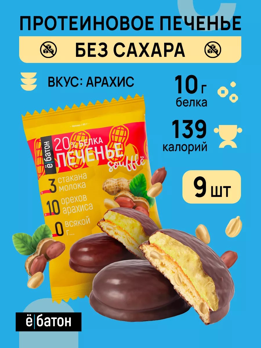 Протеиновое печенье с белковым суфле 20% белка, со вкусом арахиса 50 гр. х 9 шт. Протеиновое печенье ёбатон с суфле бесподобный десерт, состоящий из 3х частей. Нежнейшее белковое суфле без сахара, на мягком протеиновом печенье, покрытый шоколадной глазурью. Фитнес-десерт для тренирующихся и ведущих здоровый образ жизни людей. Рекомендации по употреблению: в перерывах между едой/быстрый полезный перекус, как дополнительный источник легкоусвояемых белков.