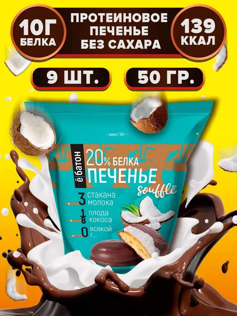 Протеиновое печенье с белковым суфле 20% белка, со вкусом шоколада, 50гр. х 9 шт. Протеиновое печенье ёбатон с суфле бесподобный десерт, состоящий из 3х частей. Нежнейшее белковое суфле без сахара, на мягком протеиновом печенье, покрытый шоколадной глазурью. Фитнес-десерт для тренирующихся и ведущих здоровый образ жизни людей. Рекомендации по употреблению: в перерывах между едой/быстрый полезный перекус, как дополнительный источник легкоусвояемых белков. Противопоказания: индивидуальная непереносимость компонентов продукта