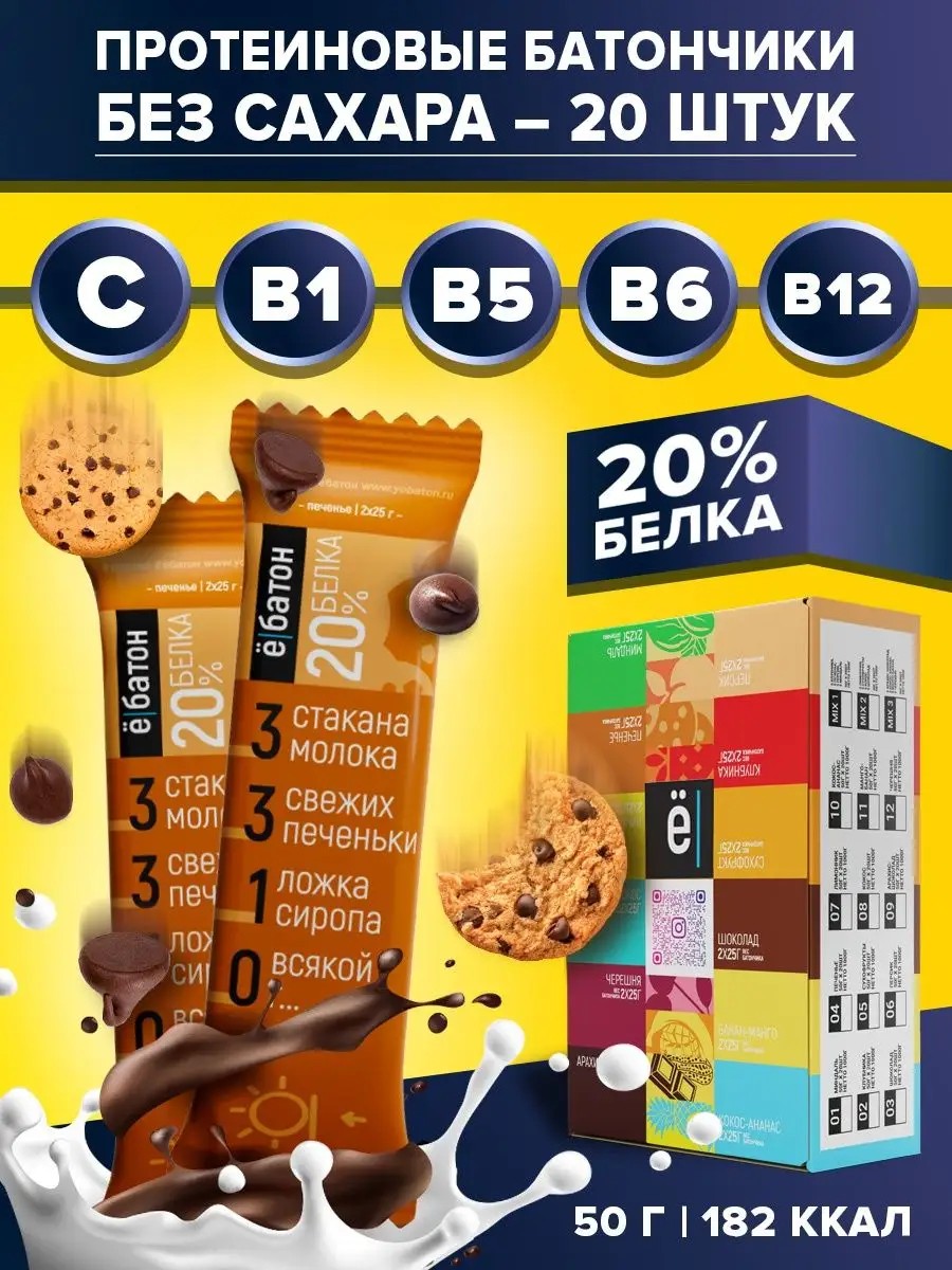 Протеиновый глазированный батончик "Ёбатон" 20% белка, со вкусом печенья, 50гр. х 20 шт. Батончики ёбатон, с содержанием белка 20%, позволят быстро утолить голод, а сочетание разных видов протеинов будут длительное время являться надежными источниками энергии.Придерживаясь простого правила - положи с вечера батончики от ё батон себе в сумку, вы обеспечиваете свой организм энергией и без набора лишнего веса, в отличие от десертов с сахаром, булочек или пирожных в обеденный перерыв. Здоровое питание станет таким простым, а в зависимости от ваших вкусовых предпочтений, вы можете выбрать свой вкус. Находясь в автомобильной пробке или офисе, на отдыхе с друзьями или на парах, на велопрогулке или в спортзале - для восполнения энергии при отсутствии возможности полноценного приема пищи или между ними воспользуйся батончиками от ёбатон!В состав батончиков от ё батон входят витамины и минералы, различные виды протеина, клетчатка и особые активные компоненты. Важно, что они предназначены не только для спортсменов, а для всех людей, следящих за своим питанием.
