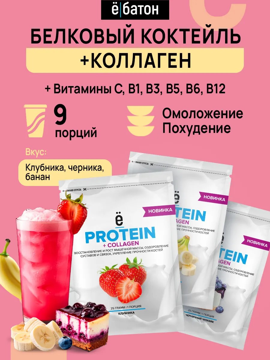 Protein Shake + Collagen, with flavors (banana, blueberry cheesecake, strawberry) 9 packets of 25 g. A complex of protein shake + Collagen: A modern format for maintaining health and shaping a beautiful figure, in the form of a low-calorie and nutritious snack. Two products essential for a healthy and energetic life in one go. Protein shake - nourishes muscles and restores them after training. Collagen - maintains the beauty and youth of the body and is responsible for skin turgor, the aesthetic appearance of nails and hair, joint strength, ligament elasticity, metabolism and liver function. The product is recommended as an additional source of protein to the main diet to optimize nutrition with a balanced diet, a healthy lifestyle and for better recovery after physical activity. Recommendations: for maximum effect, take one serving (contents of one packet) of the product up to three times a day between meals or in accordance with your individual nutrition program.