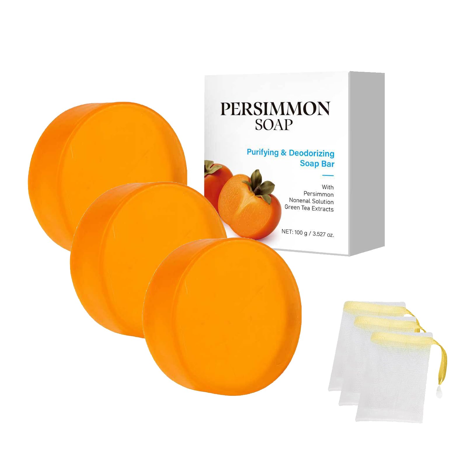: Revitalize your skincare routine with Persimmon Soap, a powerful, natural body and face cleansing solution that fights odor at its source. Enriched with antioxidant extracts of persimmon and green tea, the soap eliminates unpleasant odors, including aging and perspiration smells, making it ideal for women and men of all ages. Its deep-cleansing formula gently cleanses without drying out the skin, while the included foaming net provides extra lather and a spa-like experience. Whether you desire fresher skin or want to combat stubborn body odor, this gentle, nourishing soap provides lasting freshness, hydration, and a secure feeling with every use. SAFETY WARNING Store in a cool, dry place away from sunlight.Complete spa experience: Includes a premium foam net for a rich, luxurious lather that boosts cleansing performance and transforms your shower into a rejuvenating ritual. Moisturizing and gentle formula: This moisturizing soap is suitable for all skin types, cleanses without drying, and leaves skin feeling soft and supple after every wash—perfect for daily use on face and body. Rich in antioxidants: Enriched with green tea and persimmon extracts, this nourishing soap fights free radicals, soothes skin, and supports a healthy, radiant complexion. Deep cleansing action: Gently removes impurities and excess oil from the face and body, deeply cleansing pores while preserving the skin's natural moisture balance for a refreshingly clean feeling. Deodorizing power: Enriched with natural persimmon extract, this soap effectively eliminates body odor, including stubborn "old" odors and perspiration odors, leaving skin feeling fresh and clean all day.Savon de kaki - Savon naturel désodorisant pour le corps à l'extrait de kaki - Nettoie en profondeur et hydrate - Pour homme et femme - 100 g - Avec filet en mousse (3)DESCRIPTION DU PRODUIT DESCRIPTION DU PRODUIT Description du produit: Revitalisez votre soin de la peau avec le savon Persimmon, une solution puissante et naturelle pour le nettoyage du corps et du visage qui combat les odeurs à la racine. Le savon enrichi en extraits antioxydants de persimone et de thé vert élimine les odeurs désagréables, y compris les odeurs de vieillissement et de sueur, ce qui le rend idéal pour les femmes et les hommes de tous âges. Sa formule nettoyante en profondeur nettoie en douceur sans dessécher la peau, tandis que le filet en mousse fourni offre une mousse supplémentaire et une expérience similaire au spa. Que vous souhaitiez une peau plus fraîche ou que vous souhaitiez combattre les odeurs corporelles tenaces, ce savon doux et nourrissant vous apporte une fraîcheur durable, une hydratation et une sensation de sécurité à chaque utilisation. AVERTISSEMENT DE SÉCURITÉ Conservez-le dans un endroit frais et sec à l'abri du soleilExpérience de spa complète : comprend un filet en mousse de qualité supérieure pour une mousse riche et luxueuse qui augmente les performances de nettoyage et transforme votre douche en rituel rajeunissant. Formule hydratante et douce : ce savon hydratant convient à tous les types de peau, nettoie sans dessécher la peau et laisse une peau douce et souple après chaque lavage - parfait pour une utilisation quotidienne sur le visage et le corps. Riche en antioxydants : enrichi en extraits de thé vert et de kaki, ce savon nourrissant combat les radicaux libres, apaise la peau et soutient un teint sain et éclatant. Action nettoyante en profondeur : élimine en douceur les impuretés et l'excès de sébum du visage et du corps, nettoie en profondeur les pores tout en préservant l'équilibre naturel d'hydratation de la peau pour une sensation de nettoyage rafraîchissante. Pouvoir déodorant : enrichi en extrait naturel de kaki, ce savon élimine efficacement les odeurs corporelles, y compris les odeurs de «vieillesse» tenaces et les odeurs de transpiration, laissant la peau fraîche et propre toute la journée.
