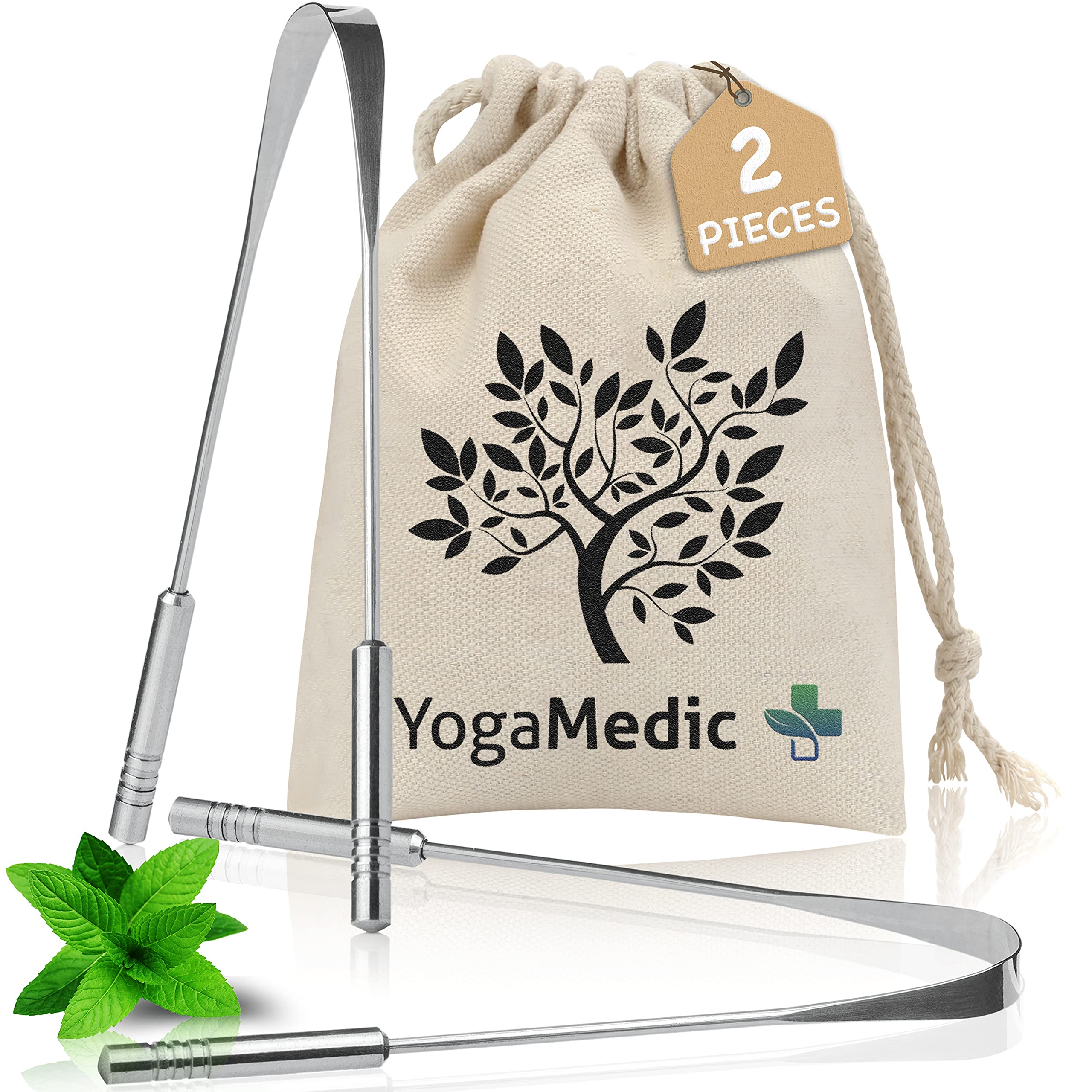 EASY USE CLEAN: Scrape your tongue for 10 seconds twice a day, starting from the back and moving towards the front. Afterwards, simply rinse the tongue cleaner with tap water. Take your companion travelling with our included bag made of 100 recycled cotton. DURABLE, 100 STAINLESS STEEL: We craft our cleaners only from premium materials that are zero waste and more sustainable than plastic. Providing you with a reliable ally in fighting gunk. With tongue scraping, give your mouth the treatment it deserves. ENHANCE TASTE SENSATIONS: Our tongue cleaners enable you to experience flavours with newfound intensity by removing tongue coating and restoring your taste sensitivity. Relish the nuances of your beloved coffee or indulge in your favourite food to the fullest. UPGRADED ORAL HYGIENE: Our tongue scrapers set take your oral care routine to the next level by targeting the prime breeding ground for bacteria- the tongue. Elevate your oral hygiene for healthy gums and teeth with just 10 extra seconds a day. UNLEASH FRESH BREATH: You don't need to stop laughing to hide your bad breath anymore. YogaMedic tongue scraper effectively removes the hidden bacteria, plaque, and food particles responsible for odours. Regain your confidence and get closer to people.