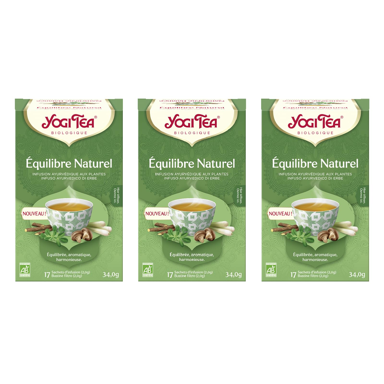 Description du produit Yogi Tea, Chaï Curcuma, Thé Bio, Excellent pour le lait doré, Mélange de Curcuma, Cannelle et Gingembre, Paquet de 6 x 17 Sachets (102 Sachets de Thé au total) L'infusion pour ceux qui sont en quête d'enchantement. Caractérisée par un jaune doré intense, la racine de curcuma était déjà considérée comme sacrée en Inde il y a 5000 ans. Combinée à de délicieuses épices chaï, comme la cannelle moelleuse et la cardamome, elle s'épanouit de toute sa splendeur dans cette infusion. La savourer confère une chaleur exotique et offre de merveilleux moments. Yoga pour stimuler l'intuition Asseyez-vous dans la position où vous êtes le plus à l'aise, en gardant la colonne vertébrale bien droite. Tendez tour à tour vos bras et vos mains vers l'avant, puis ramenez-les vers l'arrière par le côté, le long du corps, comme si vous faisiez des mouvements de crawl. Veillez à faire partir vos mouvements depuis les épaules. Laissez votre respiration se réguler d'elle-même. Veuillez demander à votre médecin si cet exercice est adapté pour vous. Depuis plus de 40 ans, Yogi Tea est synonyme de délicieux thés aux épices et de tisanes basés sur des recettes de thé ayurvédiques uniques qui trouvent leurs racines dans une philosophie indienne de plus de 3 000 ans. Ceux qui vivent en pleine conscience découvrent une grande valeur dans les petites choses. Yogi Tea est convaincu que tout le monde peut profiter d'une vie équilibrée, et une tasse de thé contient une quantité incroyable d'inspiration pour y arriver ! PRÉPARATION: versez 250ml d'eau fraîchement bouillie sur le sachet de thé. Laissez infuser pendant 7-9 minutes (ou plus longtemps pour une saveur plus prononcée). Ajoutez du lait ou un substitut de lait et sucrez selon le goût. Ingrédients Ingrédients : Curcuma (55 ), cannelle (14 ), réglisse , gingembre (7 ), cardamome (3 ), poivre noir , pomme , fenouil , macis , écorces de cacao , clous de girofle . certifié