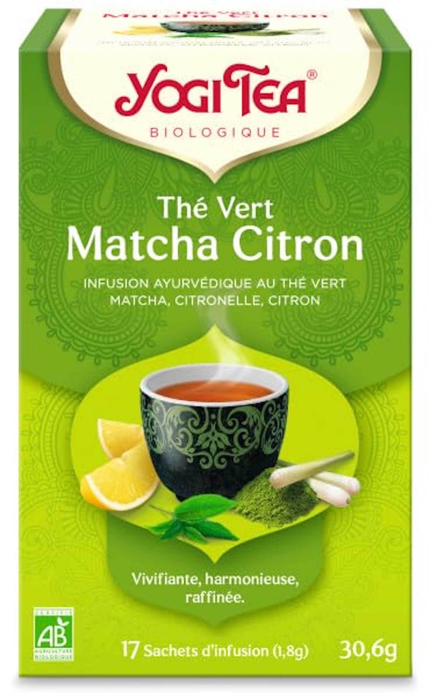 A TRUSTED BRAND: Inspired by Ayurveda, YOGI TEA offers a diverse range of teas and herbal infusions, combining natural ingredients for optimal well-being. Discover the quality and authenticity of YOGI TEA products. SUSTAINABLE: 17 heat-sealed bags to preserve freshness, staple-free and fully compostable. Each bag is designed to preserve the aromas and quality of the infusion, guaranteeing an optimal taste experience. Recyclable cardboard box. AN EASY INFUSION TO PREPARE: Infuse for 5 minutes in 200 ml of water at 100 C. Perfect teas and infusions for quick preparation, allowing you to enjoy your daily beverage in no time. AN ORGANIC AND HEALTHY PLEASURE: Organic infusion, gluten-free, lactose-free, caffeine-free, vegan, and authentically Ayurvedic. Enjoy the benefits of this flavorful Ayurvedic herbal tea, ideal for a healthy and natural tasting experience. AN ENERGIZING BLEND: An infusion of green tea and matcha, enhanced by the freshness of lemongrass and the natural acidity of lemon. Perfect for an invigorating break at any time of day, it provides a natural boost and a moment of well-being.