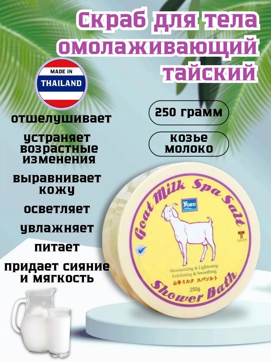 salt scrub for body and shower with goat's milk offers intensive cleansing and rejuvenation of the skin in just a few minutes a week. This Thai body scrub is ideal for all skin types showing signs of aging. This dry body scrub contains salt and citric acid, which remove the stratum corneum, normalize pH, and help the skin absorb beneficial substances. This Thai scrub contains collagen, vitamins B3 and E, which moisturize, nourish, draw out harmful substances, protect the skin from negative factors, and provide a powerful rejuvenating effect. This salt body scrub with goat's milk extracts restores the epidermis, improves overall skin tone, makes it smooth and soft, and reduces dark spots on the knees, elbows, inner thighs, and other parts of the body. Additionally, Thai body scrubs help clear clogged pores, remove dead skin cells, and massage the upper layers of the skin, increasing blood circulation. These Thai products are also used to lighten age spots and improve skin tone.