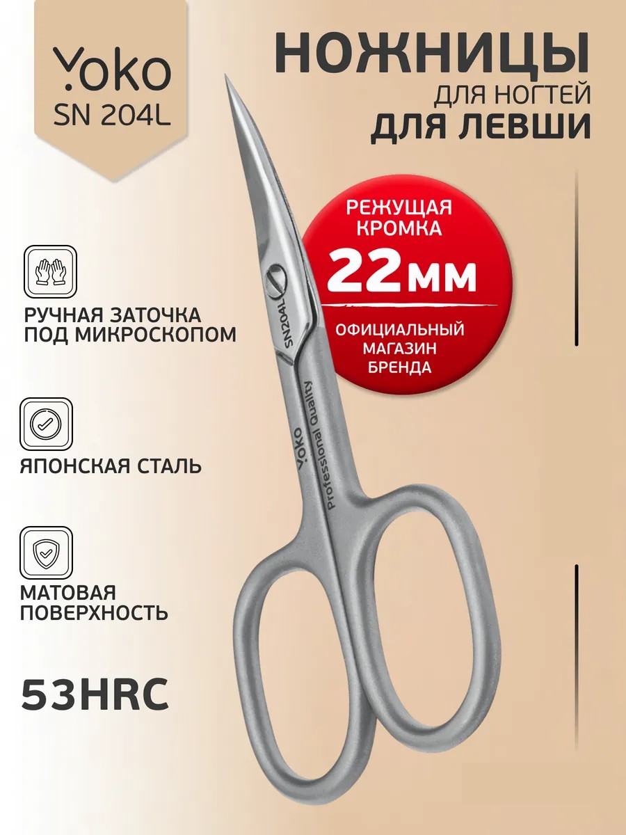 Premium Series. Yoko SN 204L left-handed nail and toenail scissors feature medium rings, a 22 mm cutting edge, and a total length of 90 mm. These manicure scissors are made of Japanese alloy steel. After metal processing and hardening, the material achieves a hardness of 53 HRC. Our specialists carefully sharpen these pedicure scissors by hand and adjust the blade stroke correctly. This results in some of the best scissors on the Russian market in terms of sharpening quality and stroke adjustment. When care instructions are followed, they will not squeak, stick, or rust. A professional tool for manicures and pedicures.