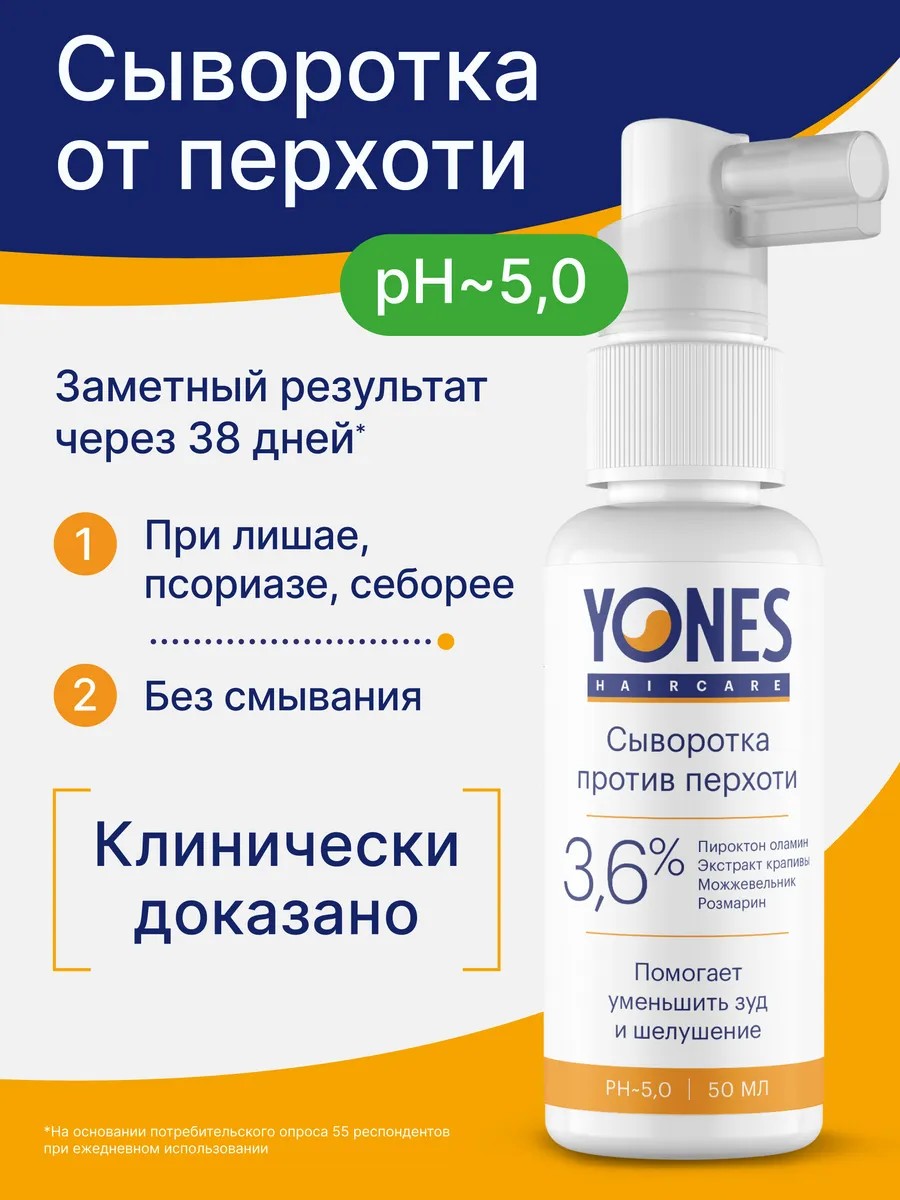 YONES serum is a professional treatment for dandruff and seborrheic dermatitis. Piroctone olamine is a key active ingredient in this leave-in serum. Dermatologists note its strong antifungal and bactericidal properties, and it also relieves itching and flaking. Therefore, the serum prevents the development of microbial flora, such as during scratching, when the risk of skin damage and infection is high. Thanks to its active formula with piroctone olamine, the serum has high substantivity, meaning it stays on the scalp and hair longer than other brands' products for all hair types and sensitive scalps. This results in a pronounced, prolonged therapeutic anti-dandruff and scalp-soothing effect. From the first use of this moisturizing serum for both women and men, suppression of lipophilic yeast activity and normalization of sebum production are observed. Therefore, inflammation and redness are quickly relieved. The active formula of nettle extract has anti-inflammatory, moisturizing, and strengthening effects. Nettle enriches the scalp and hair roots with oxygen, enhances tissue metabolism, removes excess oil, and restores lipid balance. Rosemary oil enhances the antioxidant, anti-inflammatory, and crust-removing effects. A key advantage of the active formula with piroctone olamine is its excellent compatibility with other therapeutic and cosmetic products. This anti-dandruff serum is often used in combination with hair growth and anti-hair loss products. Because the skin becomes healthy and fungi and bacteria do not proliferate, favorable conditions are created for the restoration of the scalp's natural processes.