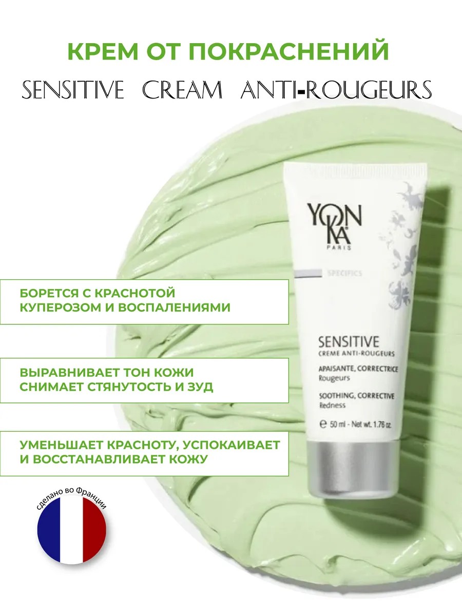 Крем против покраснений Sensitive Anti Rougeurs Yon-Ka— это Французское эффективное средство, которое заметно улучшает внешний вид кожи, склонной к покраснениям, будь они временные или постоянные, локализованные или диффузные. Лёгкая, успокаивающая формула помогает бороться с краснотой, куперозом и воспалениями, выравнивает тон и дарит ощущение комфорта, снимая стянутость и зуд. Мягкий зелёный оттенок обеспечивает моментальный «CC-эффект» цветокоррекции, нейтрализуя покраснения. Состав тщательно продуман: экстракт центеллы азиатской и мирабилис (чудо-перуанское растение) уменьшает красный цвет и способствует восстановлению, бисаболол успокаивает, а растительный глицерин, оливковый фитосквалан и полисахариды, богатые фукозой увлажняют и защищают. Yonka Sensibiotic-комплекс восстанавливает чувствительную kожу. Йонка подходит для дневного и ночного применения, воздействует на эпидермис без чувства тяжести или липкости, и может использоваться не только на лице, но и на области декольте или тела для комплексного ухода. Продукт безопасен для женщин и мужчин любого возраста, включая беременных, благодаря гипоаллергенному сoставу, отсутствию парабенов, отдушек и эфирных масел, а также тому, что он не вызывает комедонов и протестирован дерматологами. Йон ка антируж влияет на морщины и первые признаки возрастных изменений. Этот профессиональный уходовый cream из Франции станет отличным подарком для тех, кто ценит высокое качество косметики и заботится о красоте своей кoжи.