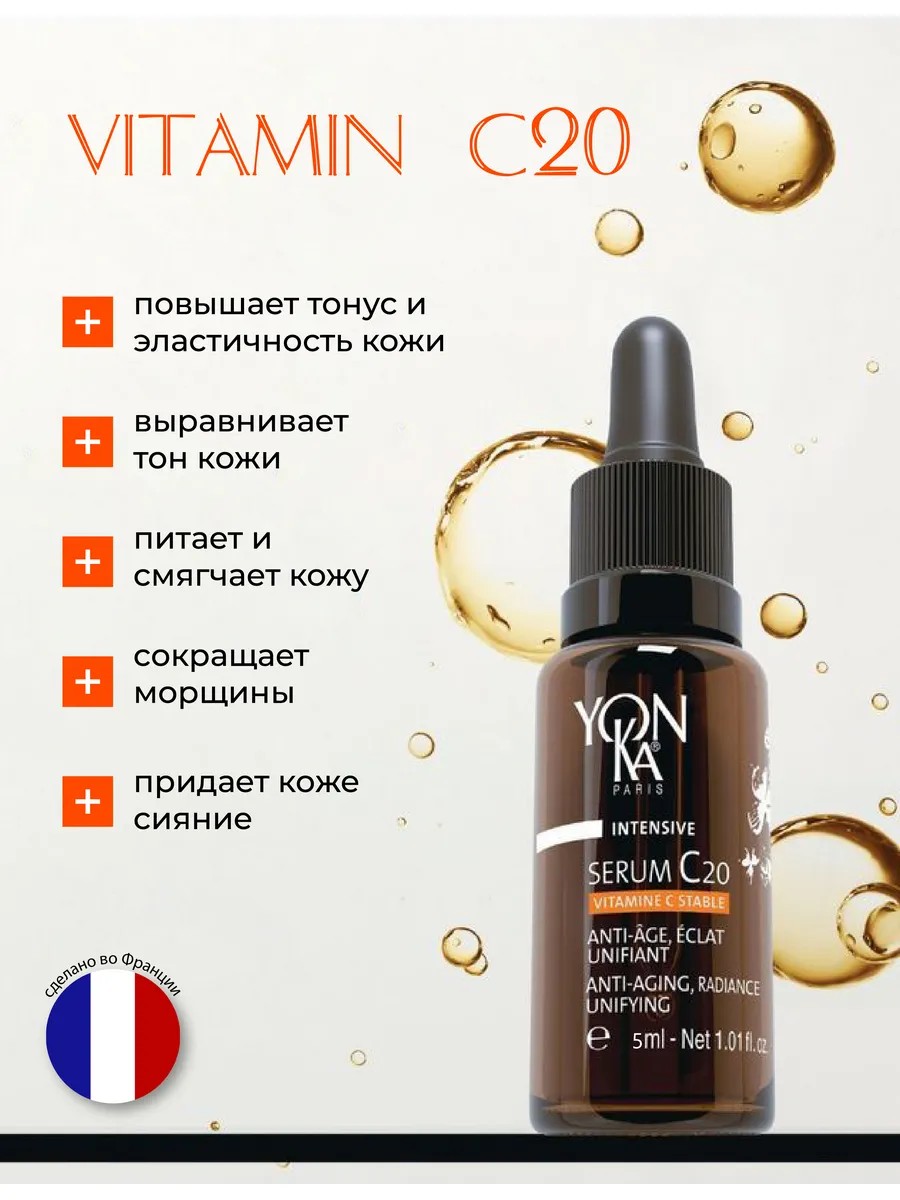 Yon-Ka Vitamin C20 (5ml) — это инновационная антивозрастная сыворотка с высокой концентрацией стабилизированного витамина С (двадцаать процентов), созданная для глубокого восстановления и улучшения состояния кoжи. Благодаря своей продвинутой формуле, она эффективно борется с тусклым цветом, потерей упругости, пигментацией и первыми признаками старения. Оказывает ярко выраженное осветляющее воздействие, выравнивает тон и улучшает текстуру, возвращая ей природное сияние.