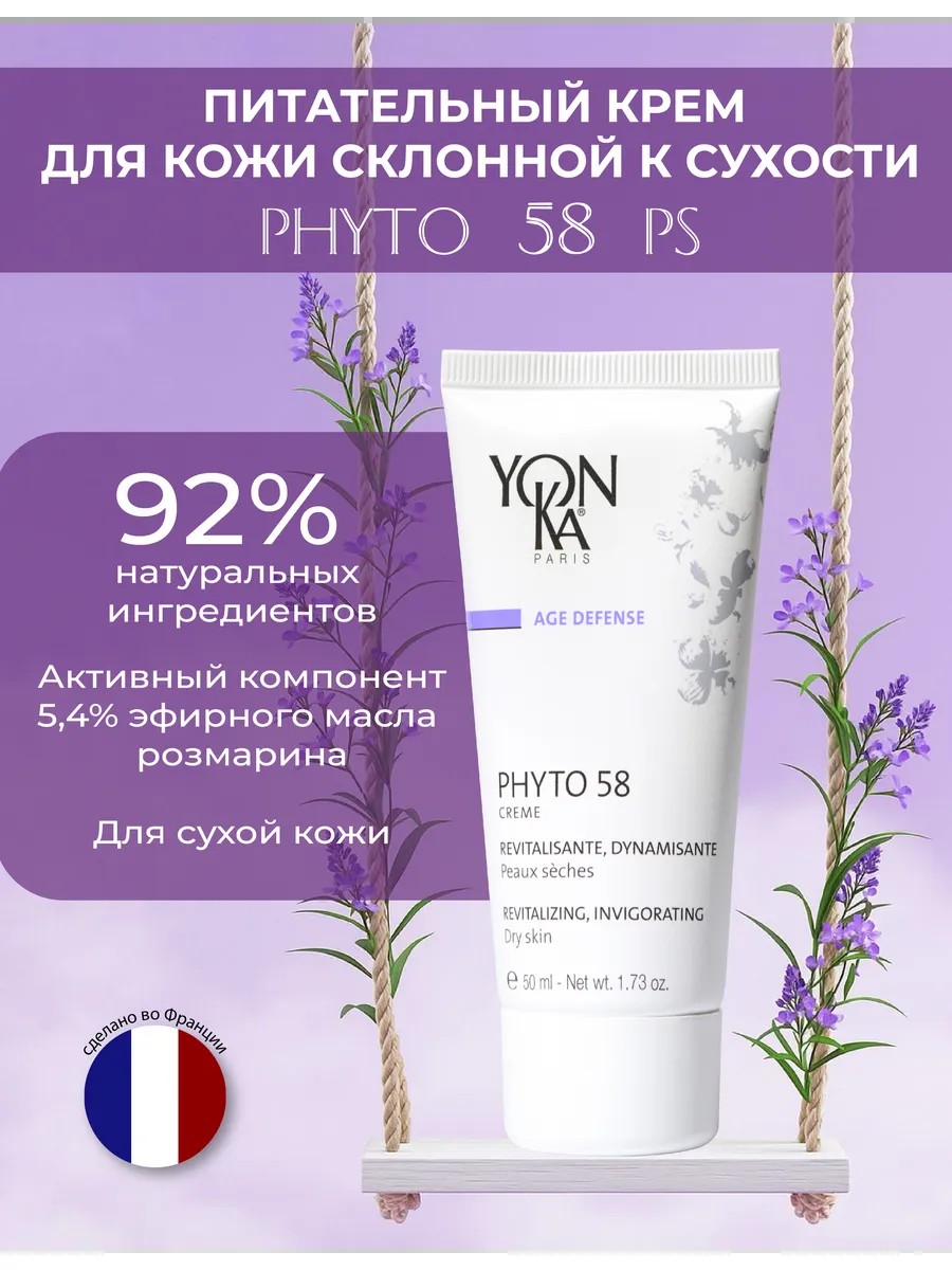 Phyto 58 PS — витаминный, питательный и укрепляющий ночной крем Французской косметики Yon-Ka с 91% натуральными ингредиентами, созданный для нормальной и склонной к сухости кожи с признаками усталости и возрастных изменений, включая морщины. Главный актив — 3% эфирного масла розмарина, которое в сочетании с фирменным комплексом Йонка Quintessence стимулирует микроциркуляцию, сужает поры, способствует уменьшению пигментации, улучшает и укрепляет тонус, регенерирует, детоксирует, восстанавливает и оживляет. Формула, обогащенная витаминами E, A и F, маслoм сладкого миндаля, лаванды и герани, а также коллагеном и гиалуроновой кислотой, глубоко питает, увлажняет, смягчает дермис, выравнивает тон, осветляет цвет, и заметно возвращает эластичность. Повышает устойчивость к стрессу и агрессивным факторам окружающей среды. Лёгкая и быстро впитывающаяся текстура делает его идеальным завершением вечернего ритуала, помогая проснуться утром обновленной и сияющей. Рекомендован в профессиональном уходе после 35 лет для поддержания молодости и здоровья.