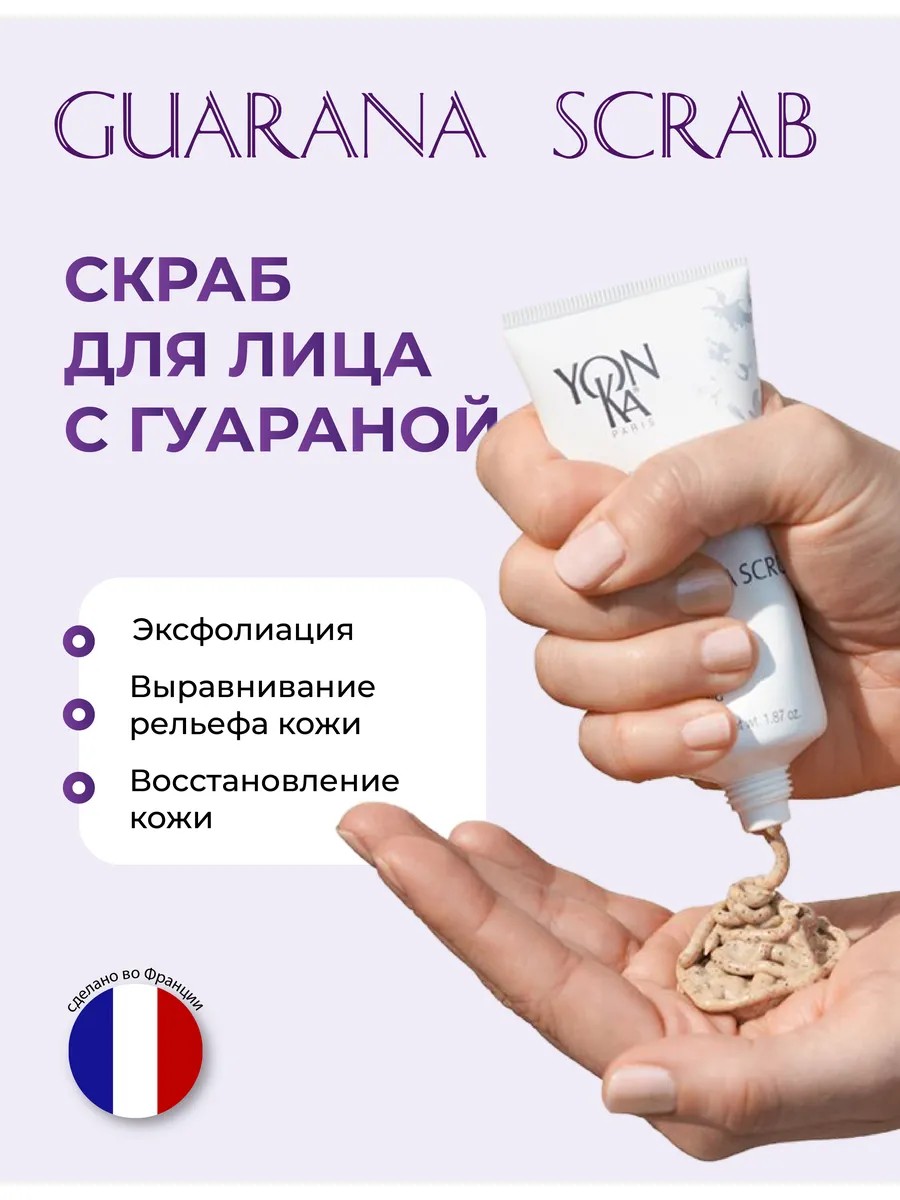 Yon-Ka Guarana Scrub — это профессиональный скраб-гоммаж с двойным действием: механическим и биологическим. Он разработан для глубокой, но бережной эксфолиации, возвращения здорового сияния и улучшения текстуры. В его составе — натуральные микрочастицы риса и бамбука, которые мягко удаляют омертвевшие клетки, а также экстракт гуараны, богатый кофеином, способствующий тонизированию и стимуляции микроциркуляции.