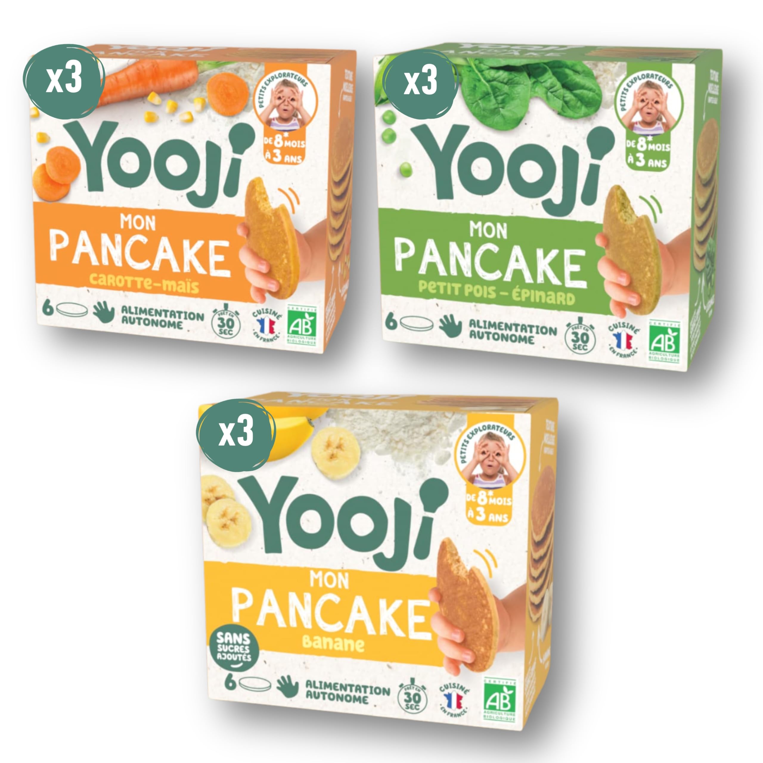 : Yooji is organic, ready-to-cook purée in small, frosted portions for babies, inspired by homemade cooking. - Frozen product, stored and delivered to your door by the frozen food specialist ChronoFresh - The Yooji Pancake Discovery Pack: With this trio, discover the first ready-to-cook pancakes for babies, cooked just like homemade! For lunch, dinner, or even as a snack: it's your new ally for varying textures and encouraging your baby to eat like a grown-up! This pack contains: 3x Pancake: Peas, Spinach 3x Pancake: Carrot, Corn 3x Pancake: Banana The advantages of our pancakes: A simple and balanced composition: 30 to 40 vegetables or fruit, whole milk, wheat and flax flour, and a touch of lemon juice and baking powder to make them rise! A soft, fluffy texture perfect for babies. An egg-free and sugar-free recipe so you can enjoy your baby without worrying about protein or sugar intake. Convenient: 30 seconds in the toaster or microwave, and it's ready! Pancake: Peas, spinach (44 vegetables, 29 wheat flour, whole milk, water, lemon juice, flaxseed flour, raising agent: sodium bicarbonate). Pancake: Carrot, corn (42 vegetables, 30 wheat flour, whole milk, water, lemon juice, flaxseed flour, raising agent: sodium bicarbonate). Pancake: Banana (34 banana, 34 wheat flour, whole milk, water, lemon juice, flaxseed flour, raising agent: sodium bicarbonate). Ingredients (see description) Instructions: Heat in 30 seconds in a toaster or microwave! See more