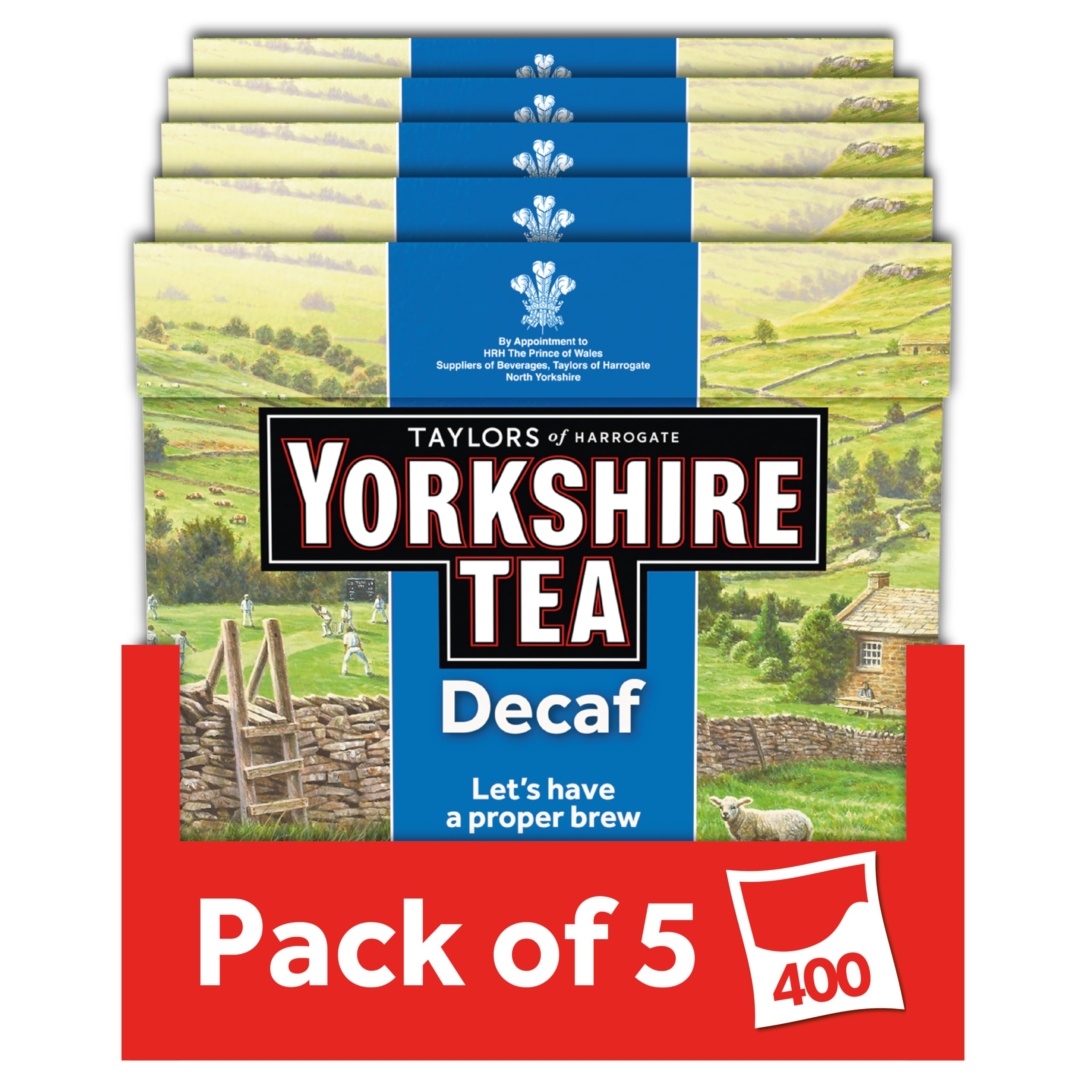 A proper tasting cup. Pure and simple. Proof that being kind to your body doesn't mean being cruel to your taste buds. Whether you're looking for a good night's sleep or simply trying to be healthy, you'll love the great taste of Yorkshire Tea Decaf. It's made from pick-of-the-harvest, just like our original blend, using premium Rwandan and Kenyan teas that aren't compromised by decaffeination. Everything we do here at Taylors of Harrogate, we like to do right. Maybe it's just the way we do things. We're a proud family business—three generations, in fact—and we've always been in the business of making good tea. Done right, it's amazing what a simple cup of tea can really do. Things have a way of feeling instantly better after a good brew. We've come a long way since we jumped out of the kettle and brewed our first pot of Yorkshire tea in the 70s. Who would have thought back then that we would go on to make one of Britain's favorite breweries? The story of Taylors of Harrogate goes back much further than the 1970s. In fact, it all began in Victorian times when, in 1886, Charles Edward Taylor and his brother Llewellyn – sons of a pea merchant and a York grocer – established the tea and coffee import business, C.E. Taylor Co. The two brothers trained at London's renowned Ashby's Tea, where they also purchased their teas and coffees at auction. Llewellyn eventually became a sleeper partner, but Charles quickly grasped the idea of opening tea and coffee tasting rooms in the burgeoning and fashionable spa towns of Harrogate and Ilkley. The rest, as they say, is history. INGREDIENTS Decaffeinated black tea (tea bags).Yorkshire Tea Decaffeinated Tea Bags 80 (Pack of 5 total of 400 bags)DESCRIPTION DU PRODUIT DESCRIPTION DU PRODUIT Une tasse de dégustation appropriée. Pure et simple. Preuve qu'être gentil avec votre corps ne signifie pas être cruel envers vos papilles. Que vous recherchiez une bonne nuit de sommeil ou que vous essayiez simplement d'être en bonne santé, vous allez adorer le bon goût du Yorkshire Tea Decaf. Il est fabriqué à partir du choix de la récolte, tout comme notre mélange original, en utilisant des thés rwandais et kenyans de qualité supérieure qui ne sont pas compromis par la décaféination. Tout ce que nous faisons ici à Taylors of Harrogate, nous aimons le faire correctement. Peut-être que c'est juste la façon de faire les choses. Nous sommes une entreprise familiale fière – trois générations, en fait, – et nous avons toujours été dans la fabrication du bon thé. Bien fait, c'est incroyable ce qu'une simple tasse de thé peut vraiment faire. Les choses ont l'habitude de se sentir instantanément mieux après une bonne infusion. Nous avons parcouru un long chemin depuis que nous avons sauté la bouilloire et brassé notre premier pot de thé Yorkshire dans les années 70. Qui aurait pensé à l'époque que nous allions faire une des brasseries préférées de Grande-Bretagne ? L"histoire de Taylors of Harrogate remonte bien plus loin que les années 70. En fait, tout a commencé à l'époque victorienne lorsqu'en 1886, Charles Edward Taylor et son frère Llewellyn – fils d'un marchand de pois et d'un maître épicier de York – créèrent l'entreprise d'importation de thé et de café CE Taylor Co. Les deux frères se sont formés au célèbre Ashby's Tea de Londres, où ils ont également acheté leurs thés et cafés aux enchères. Llewellyn est finalement devenu un partenaire endormi, mais Charles a rapidement frappé l'idée d'ouvrir des salles de dégustation de thé et de café dans les villes thermales en plein essor et à la mode de Harrogate et Ilkley. Le reste, comme on dit, est l'histoire. INGRÉDIENTS Thé décaféiné noir (sachets de thé).