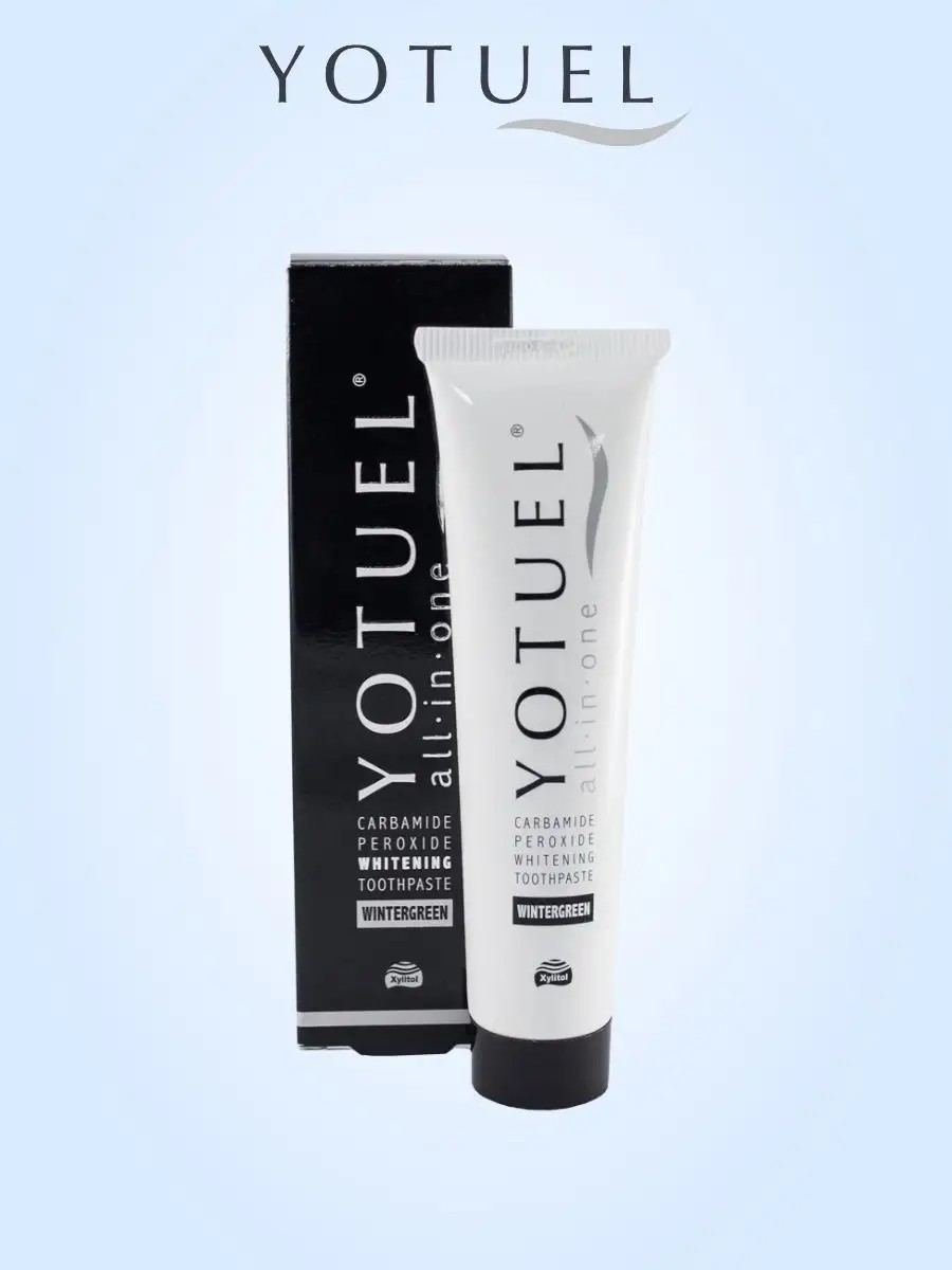 Yotuel All in One Toothpaste is a whitening toothpaste with carbamide peroxide that is not only suitable but also recommended for daily use. It effectively whitens teeth as a stand-alone home remedy thanks to its active ingredient, carbamide peroxide, at a concentration of 0.35%. It does not scratch or damage enamel and eliminates tooth sensitivity. It does not contain SLS (sodium lauryl sulfate), detergents, or soap; it is made with pure glycerin without added water. Fluoride content: 1470 ppm. Yotuel All in One Toothpaste has a pleasant thyme flavor.