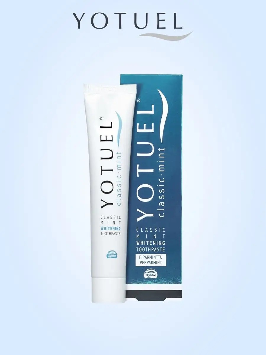 Yotuel Whitening Classic toothpaste is a whitening therapeutic and prophylactic toothpaste, like Yotuel Whitening Pharma toothpaste. It has a very low abrasiveness index (RDA 40), which indicates a safe way to remove bacterial plaque without damaging tooth enamel during brushing. In addition to abrasive and polishing agents, Yotuel Whitening Classic toothpaste contains papain, an enzyme that destroys bacterial plaque, and pyrophosphate, a substance that prevents plaque formation on tooth enamel. The presence of xylitol at a concentration of 10% achieves an antibacterial effect, fluorides participate in the restoration and prevention of demineralization of tooth enamel, and potassium molecules help reduce sensitivity. It has a pleasant mint flavor. RDA (abrasiveness index): 40 Fluoride content 1450 ppm. Yotuel Whitening Classic toothpaste is recommended for daily use. Repeat the procedure 2-3 times a day.