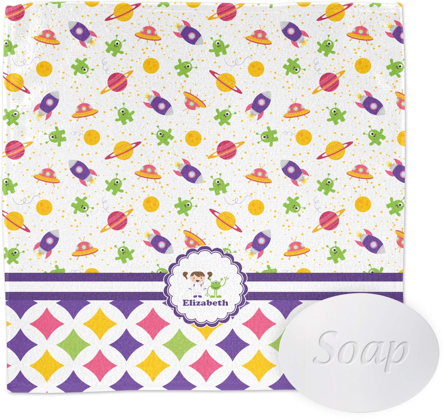 These super-soft microfiber washcloths are perfect for your face and body! These personalized face towels are beautiful, yet incredibly functional, making them the ideal addition to any bathroom in your home! These washcloths are both functional and decorative; when customized, these towels are an easy way to change up your bathroom's decor. Customize a few for yourself and your family, or give a few to friends and relatives as thoughtful, yet practical gifts! The square 12x12 face cloth is 100% microfiber, so it feel thin, however, it is very soft-to-the-touch and it is super absorbent. The soft texture makes it multipurpose; you can use this as an exfoliating washcloth for your face and body, but it can also serve as a baby's washcloth! We print your customized design across the face of this towel, while the back remains a white in color. The round corner 13x13 face towel is partly microfiber and partly cotton, The top features a luxurious, velvety-soft velour like microfiber that feels gentle on your skin, while the bottom features cotton loops. The dual texture of this face cloth makes it thicker (especially compared to the square one). It is also multi-purpose towel and ideal for your face, as well as your body. Your customization is displayed across the front of the this towel, while the back remains white in color. Design Shown: Girl's Space & Geometric Print (#40872) Features: ==================================== * [Soft and Absorbent]: Made from a blend of polyester, polyamide, and cotton for a soft, absorbent feel. * [Two Style Options]: Available in square (12" x 12") and rounded corner (13" x 13") designs. * [Multipurpose Use]: Suitable for use on face, body, and even gentle enough for baby's skin. * [Easy Care]: Machine-washable in warm water with mild detergent, hang to dry or dry on low heat. Care Instructions: ==================================== * Machine wash in warm water with mild detergent, on a gentle cycle * Avoid fabric softener, and avoid washing alongside cotton towels * Hang to dry or dry on low heat[Easy Care]: Machine-washable in warm water with mild detergent, hang to dry or dry on low heat. [Multipurpose Use]: Suitable for use on face, body, and even gentle enough for baby's skin. [Two Style Options]: Available in square (12" x 12") and rounded corner (13" x 13") designs. [Soft and Absorbent]: Made from a blend of polyester, polyamide, and cotton for a soft, absorbent feel. [Astronaut Girl]: Make a unique astronaut and alien design with your own custom text.