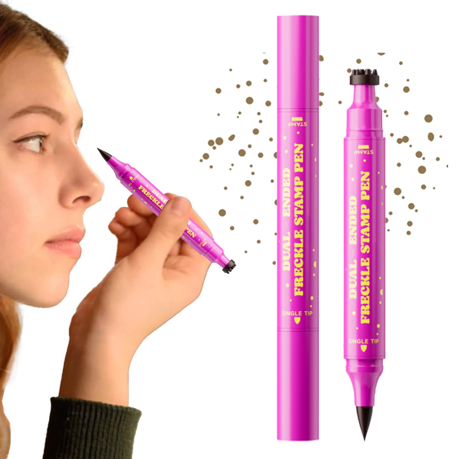 The Freckles Stamp offers an artificial beauty solution for women and girls who strive for a natural makeup look. These faux freckle stamps are waterproof and durable, making them perfect for use on the skin or face. style your eyeliner with this innovative beauty tool that stays in place all day. Specifications: Net capacity: 2.8 ml. Product list: 1 x freckle stamp Note: Due to the light and screen setting difference, the item's color may be slightly different from the pictures. Please allow 1-2cm error due to manual measurement.Excellent color fastness: deeply saturated pigments reduce the need for corrections and achieve intense color nuances even when wearing water-resistant freckles for a long time. Really working sprinkle effect: natural jumps through precise precision. Guaranteed comfortable daily use thanks to soft adhesive technology for everyday use. 2-in-1 design: fine eyeliner tip on one end and freckle stamp on the other for precise and easy makeup in two styles with just one product. Constant Adhesion: The waterproof and sweat-resistant composition adheres evenly to the skin, preventing printing or peeling for long-lasting intensive motif display. Fast Drying: The special, smooth formula dries effortlessly in even strokes for natural-looking freckles.Kunstmatige sproeten - sproeten pen waterdichte 2-in-1 kunststempel eyeliner voor natuurlijke look De Freckles Stamp biedt een kunstmatige schoonheidsoplossing voor vrouwen en meisjes die streven naar een natuurlijke make-uplook. Deze nep-freckle stempels zijn waterdicht en duurzaam, waardoor ze perfect zijn voor gebruik op de huid of gezicht. je eyeliner stijl met dit innovatieve beauty tool dat de hele dag op zijn plaats blijft. Specificaties: Netinhoud: 2,8 ml. Productlijst: 1 x sproetstempel. Opmerking: Vanwege het verschil in licht- en beeldscherminstellingen kan de kleur van het artikel enigszins afwijken van de afbeeldingen. Houd rekening met een foutmarge van 1-2 cm door handmatige meting.Uitstekende kleurvastheid: diep verzadigde pigmenten verminderen de behoefte aan correcties en krijgen intense kleurnuances zelfs bij langdurig dragen van waterbestendige sproeten. Echt werkend sprenkeleffect: natuurlijke sprongen door nauwkeurige precisie. Gegarandeerd comfortabel dagelijks gebruik dankzij zachte hechttechnologie voor dagelijks gebruik. 2-in-1 design: fijne eyeliner-punt aan het ene uiteinde en sproetstempel aan het andere voor nauwkeurige en eenvoudige make-up in twee stijlen met slechts één product. Constante hechtkracht: de waterdichte en zweetbestendige samenstelling hecht gelijkmatig aan de huid, voorkomt afdrukken of losraken voor langdurig intensieve motiefweergave. Snelle droging: de speciale, soepele formule droogt moeiteloos gelijkmatige streken voor natuurlijk uitziende sproeten.