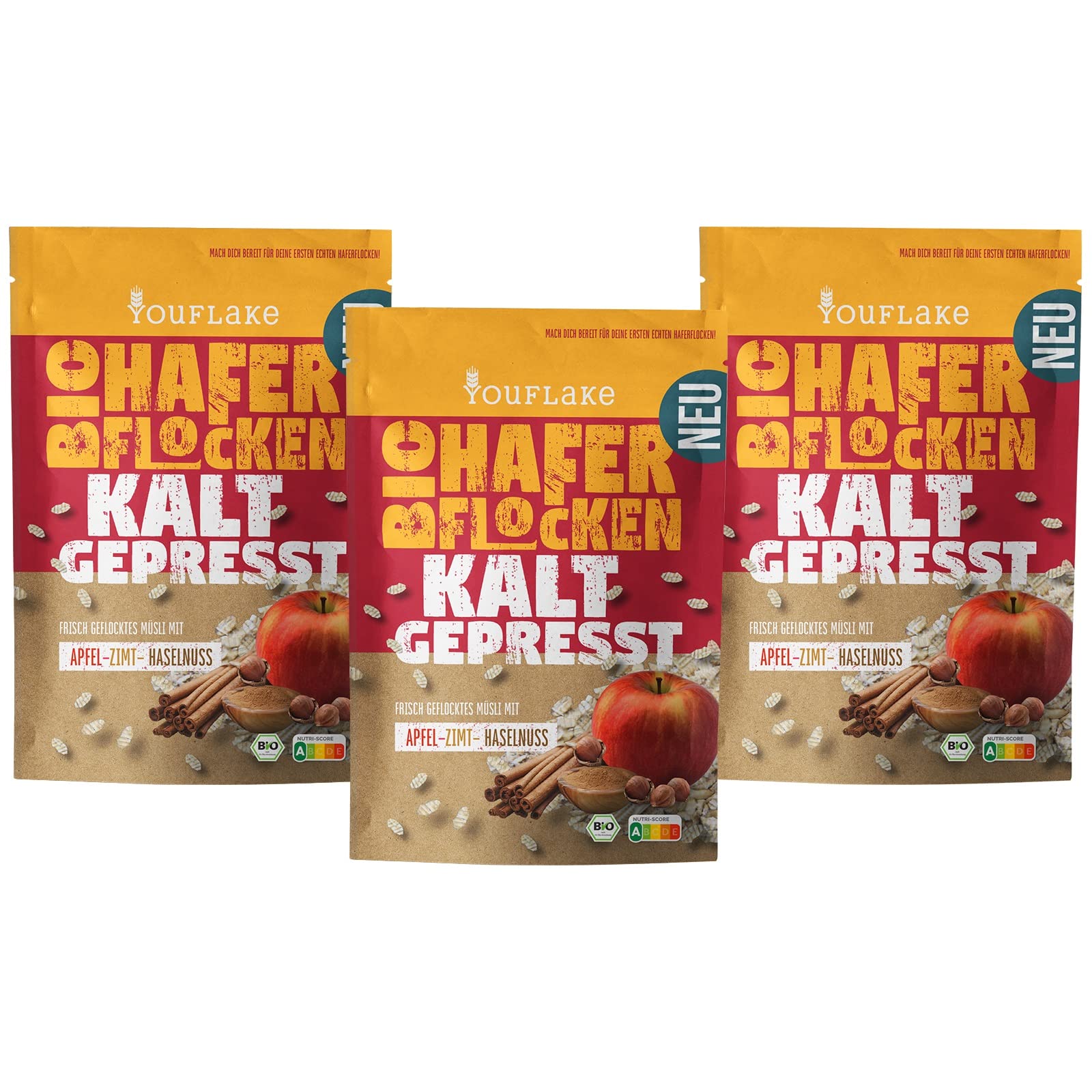 YouFlake YouFlake Organic Cold-Pressed Oats Apple-Cinnamon Hazelnut | 3 x 320g | Apple-cinnamon cereal mix with oat flakes and hazelnuts