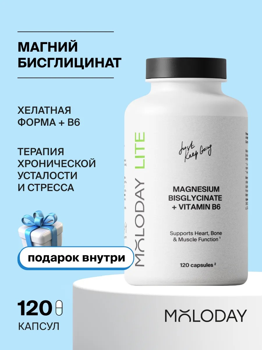 MOLODAY Магний хелат бисглицинат + витамин В6, антистресс, 120 шт