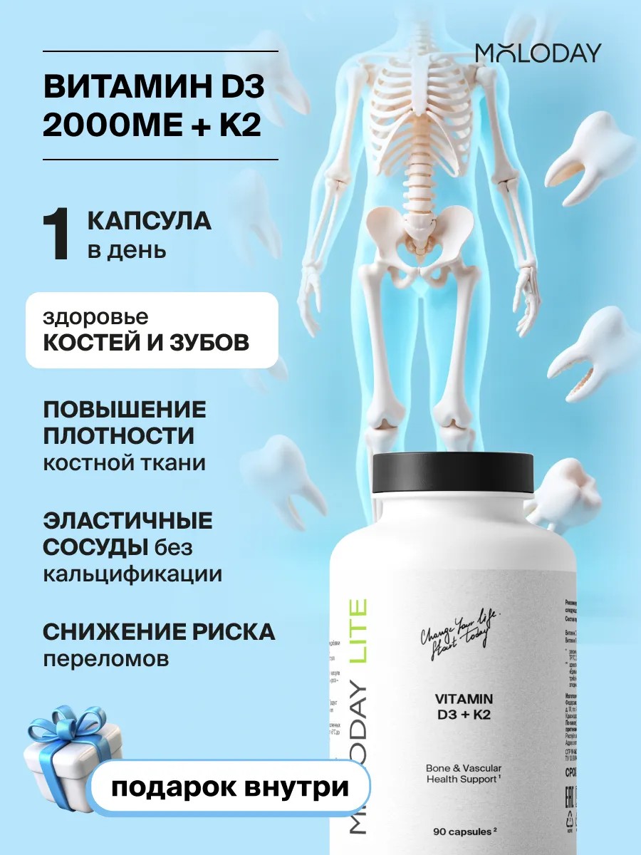 MOLODAY Витамин Д3 2000 в капсулах + К2 для костей и зубов, 90 шт