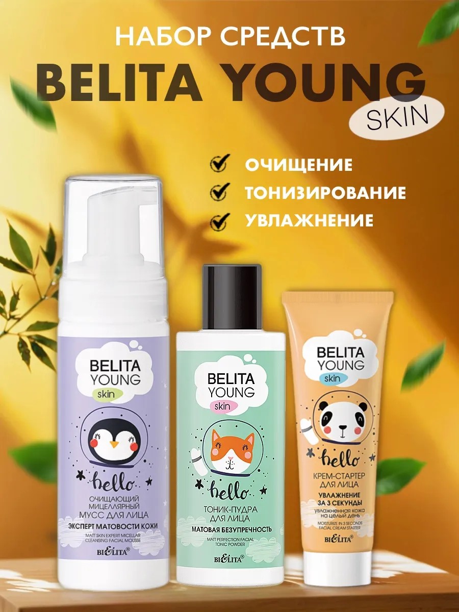 | Полное наименование товара | Косметический набор BELITA YOUNG SKIN Мусс (175 мл), тоник -пудра (115 мл), крем-стартер (50 мл) + спонж |