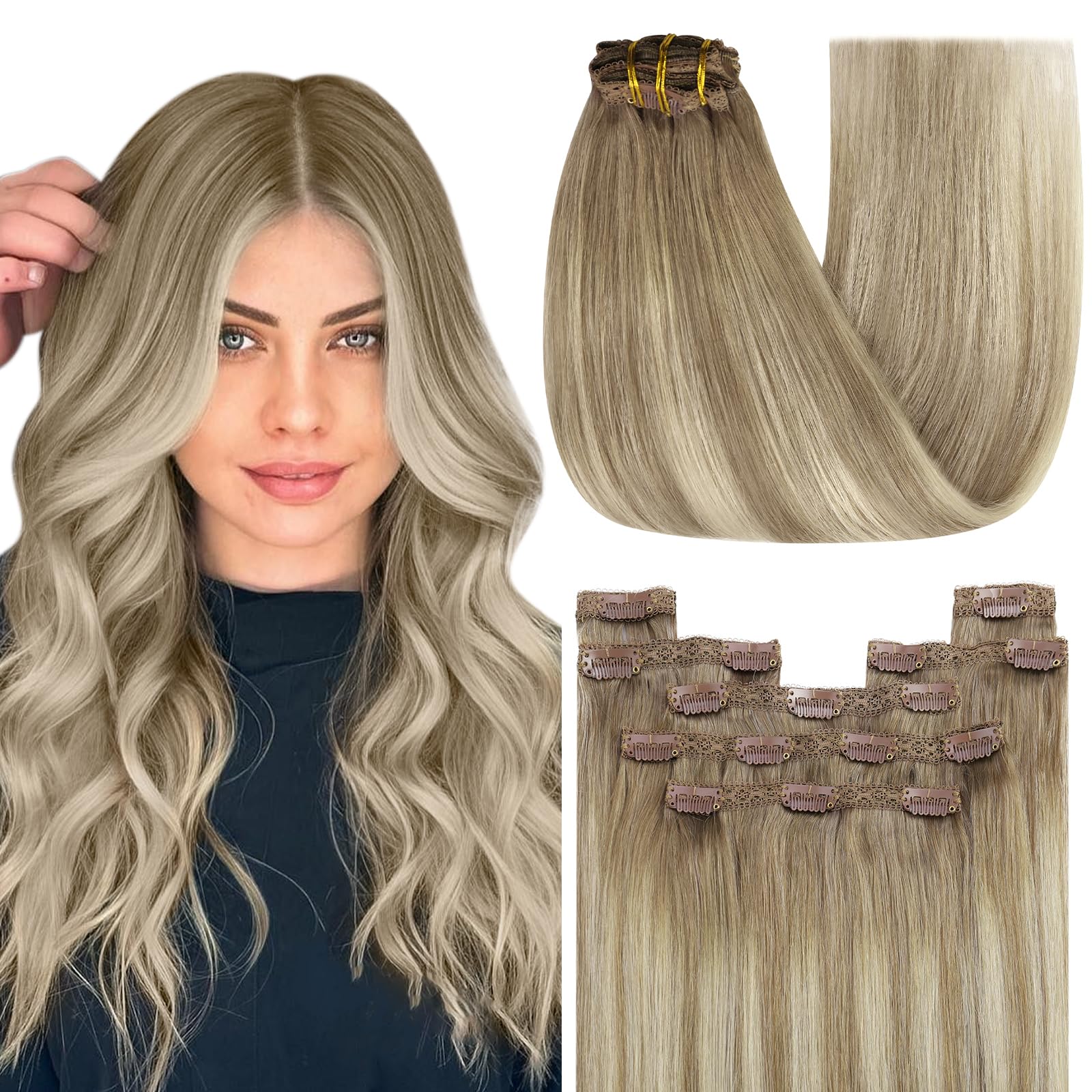 YoungSee Clip in Extensions Echthaar Ombre 40 CM Echthaar Extensions Clip Ombre Blond Clip in Haarverlangerung Echthaar Hellbraun Balayage Platinblond Clip in Haare 120g 7 Stuck #8A/60/8A