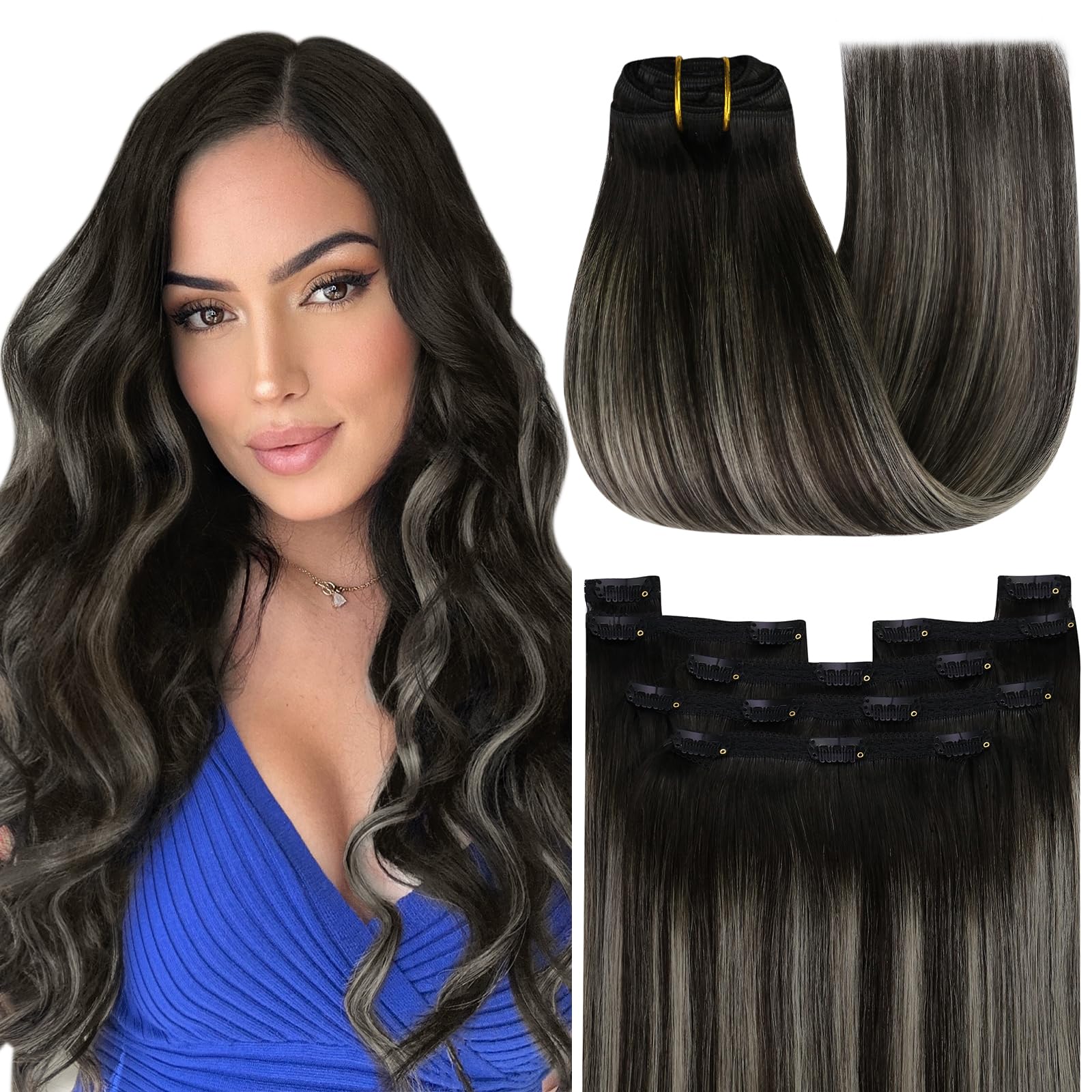 YoungSee Clip in Extensions Echthaar Ombre Schwarz mit Silber Clip in Extensions 40 cm Echthaar Extensions Clip Balayage Remy Hair Extensions Clip in Haarverlangerung Echthaar Clip 120g #1B/S/1B 40 cm (7pcs) 1-Clip-4-#1B/Silver/1B